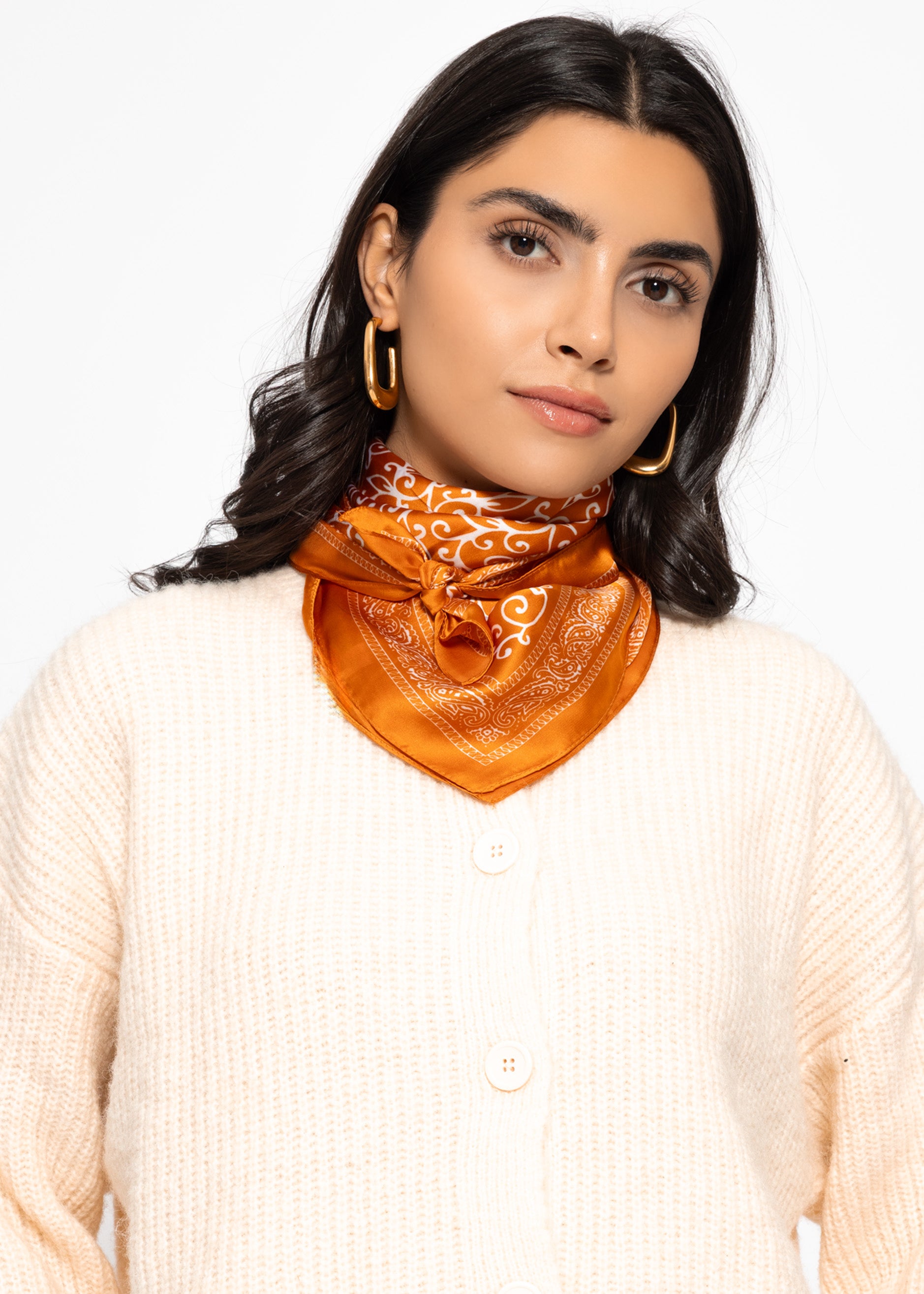 Dieses edle Halstuch bringt Eleganz in deinen Kleiderschrank. Der zarte, filigrane Print versprüht Sommerlaune und verleiht deinem Outfit Stil und Klasse, während das leichte, fließende Material für ein angenehmes Tragegefühl sorgt. Ob lässig um den Hals geschlungen, als modisches Haarband getragen oder dekorativ an der Handtasche befestigt - dieses Tuch ist der perfekte Begleiter für jede Gelegenheit.