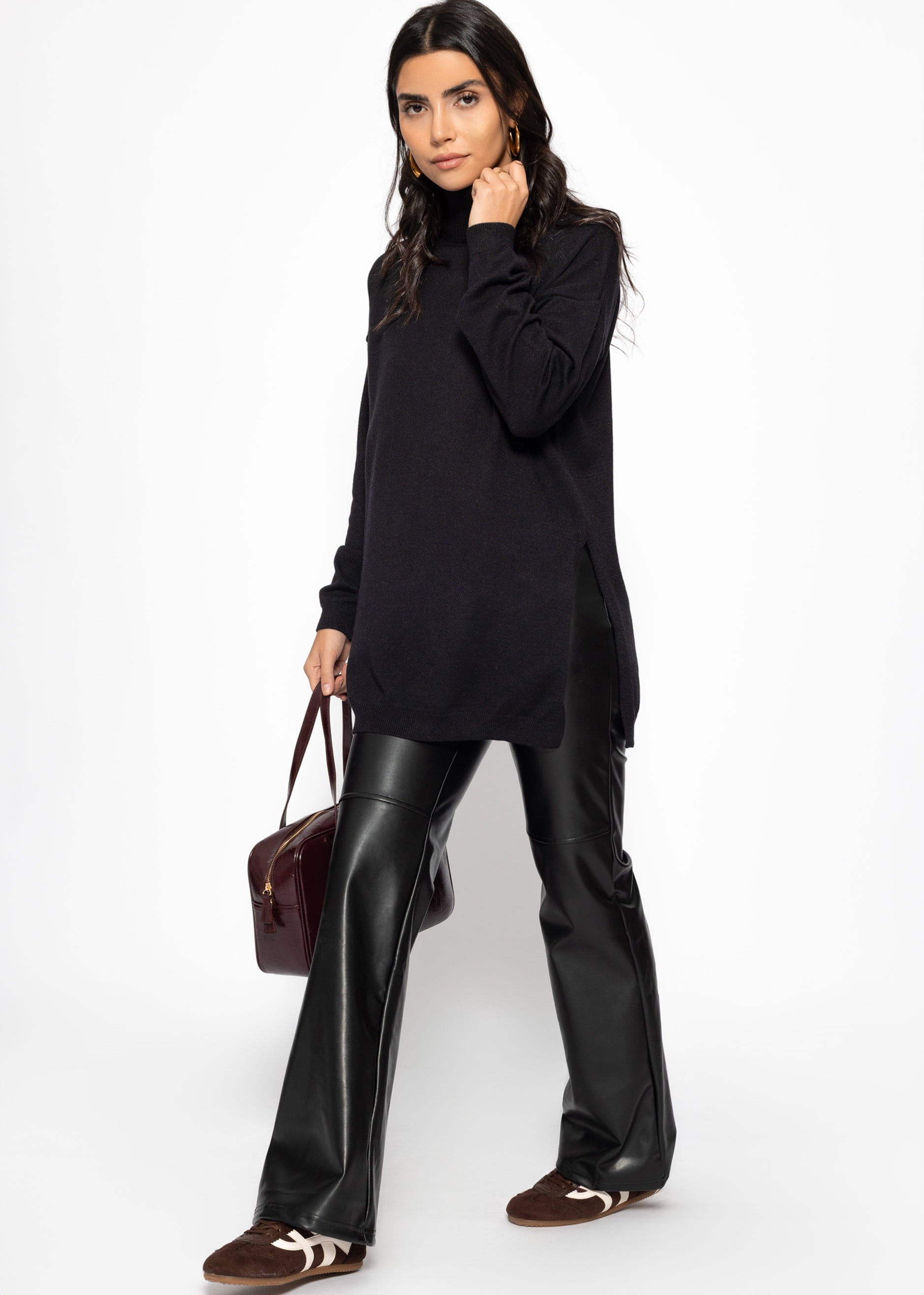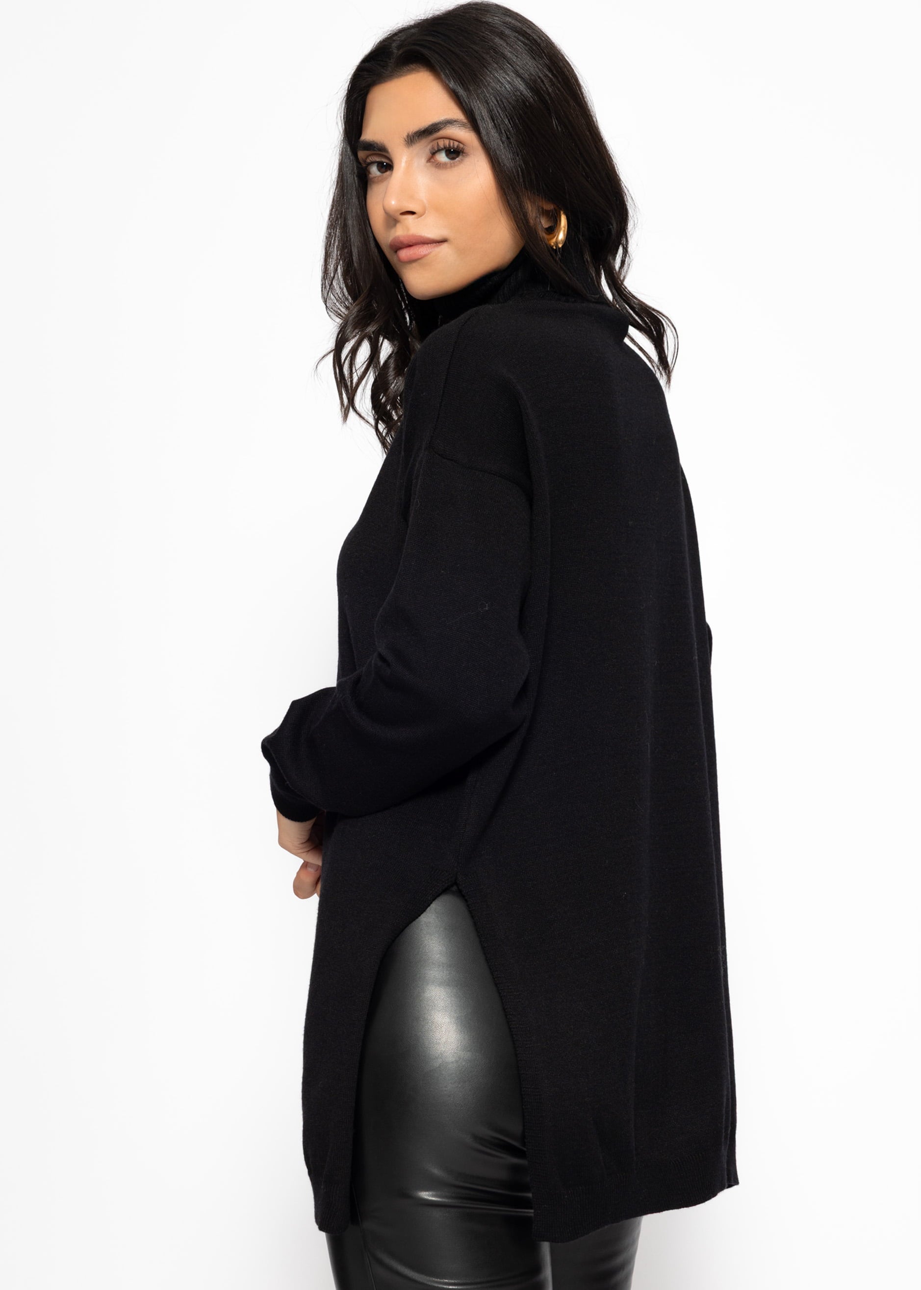 Oversize Rollkragenpullover mit langen Seitenschlitzen - schwarz