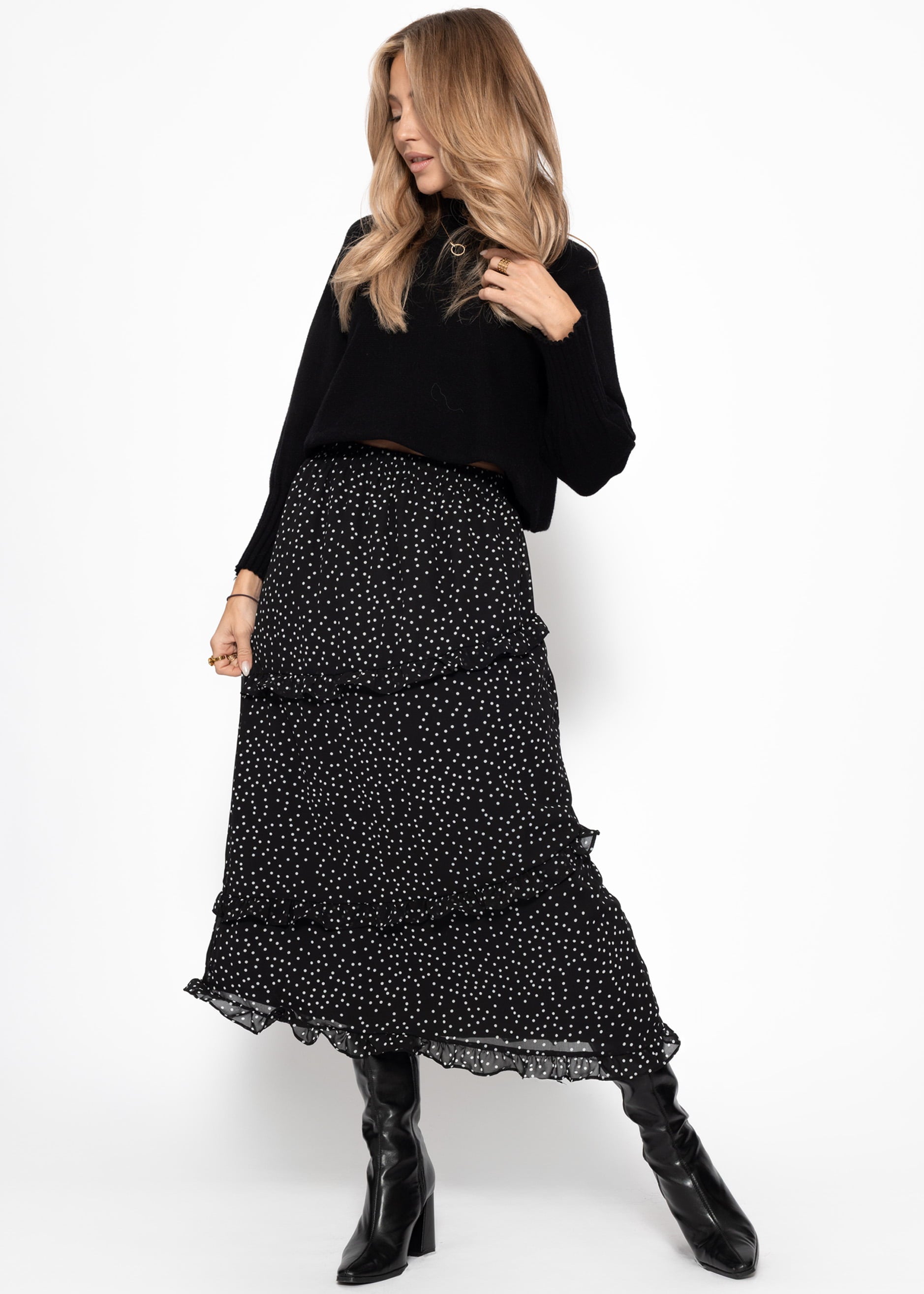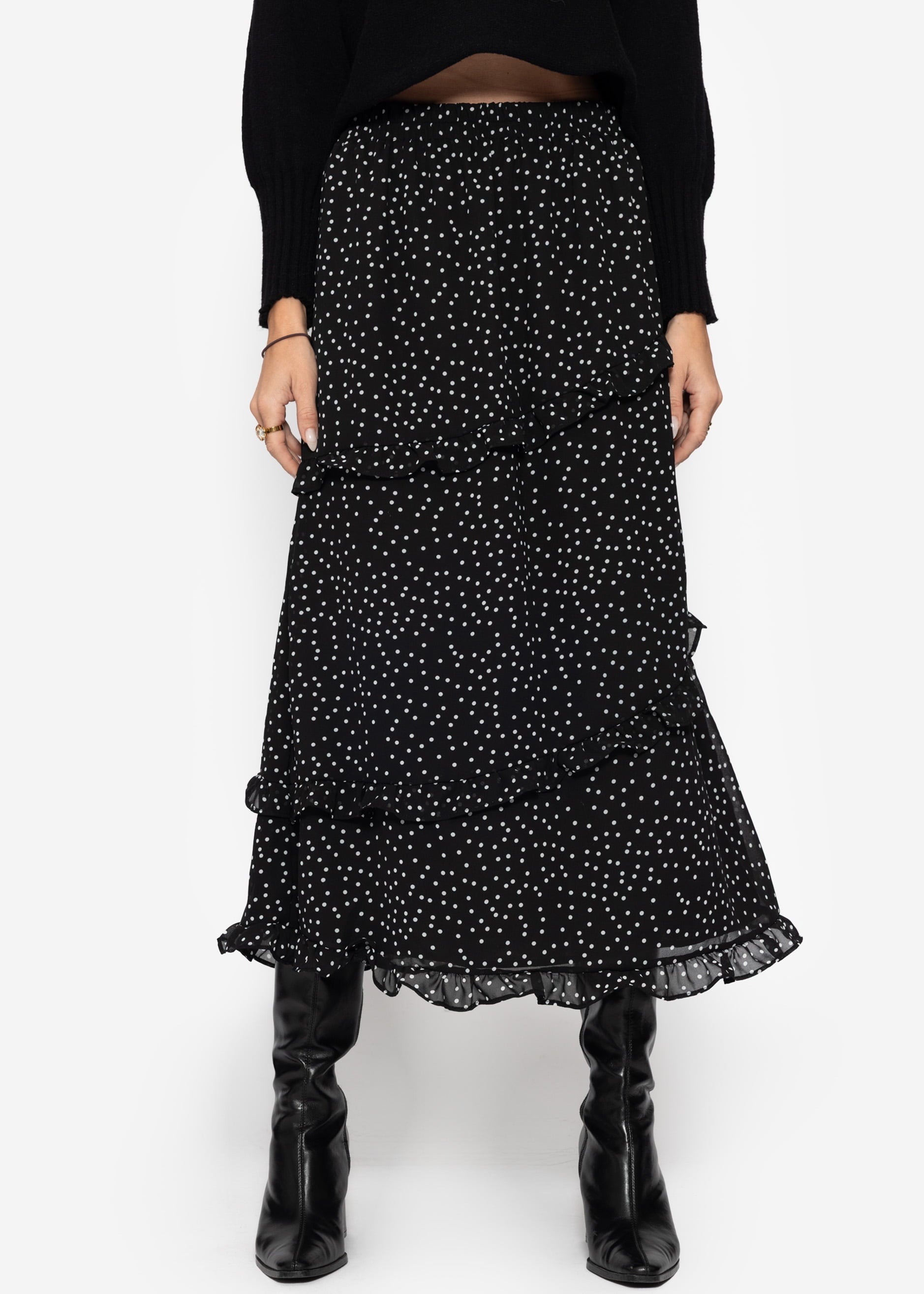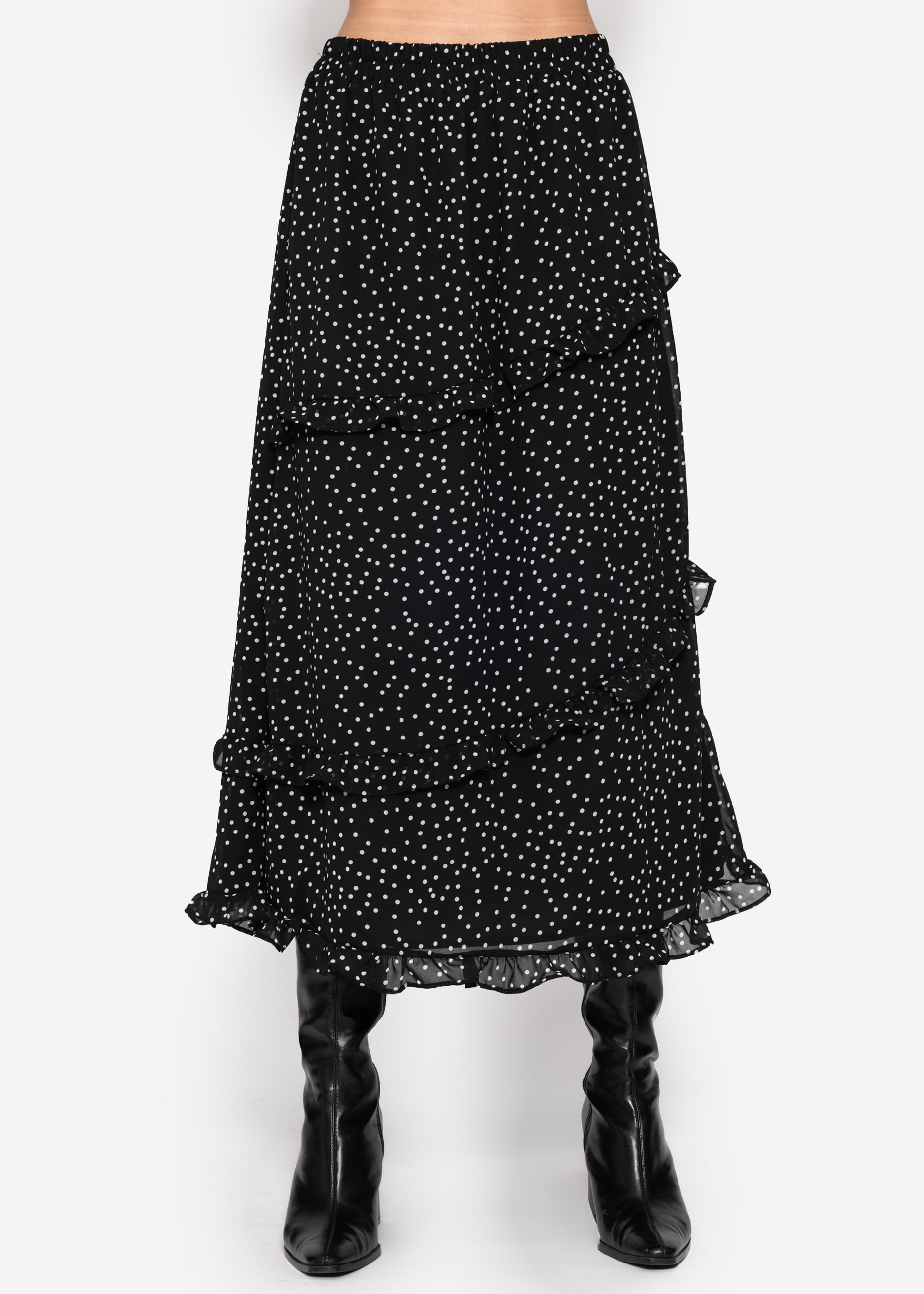 Gepunkteter langer Rock mit Rüschen - schwarz