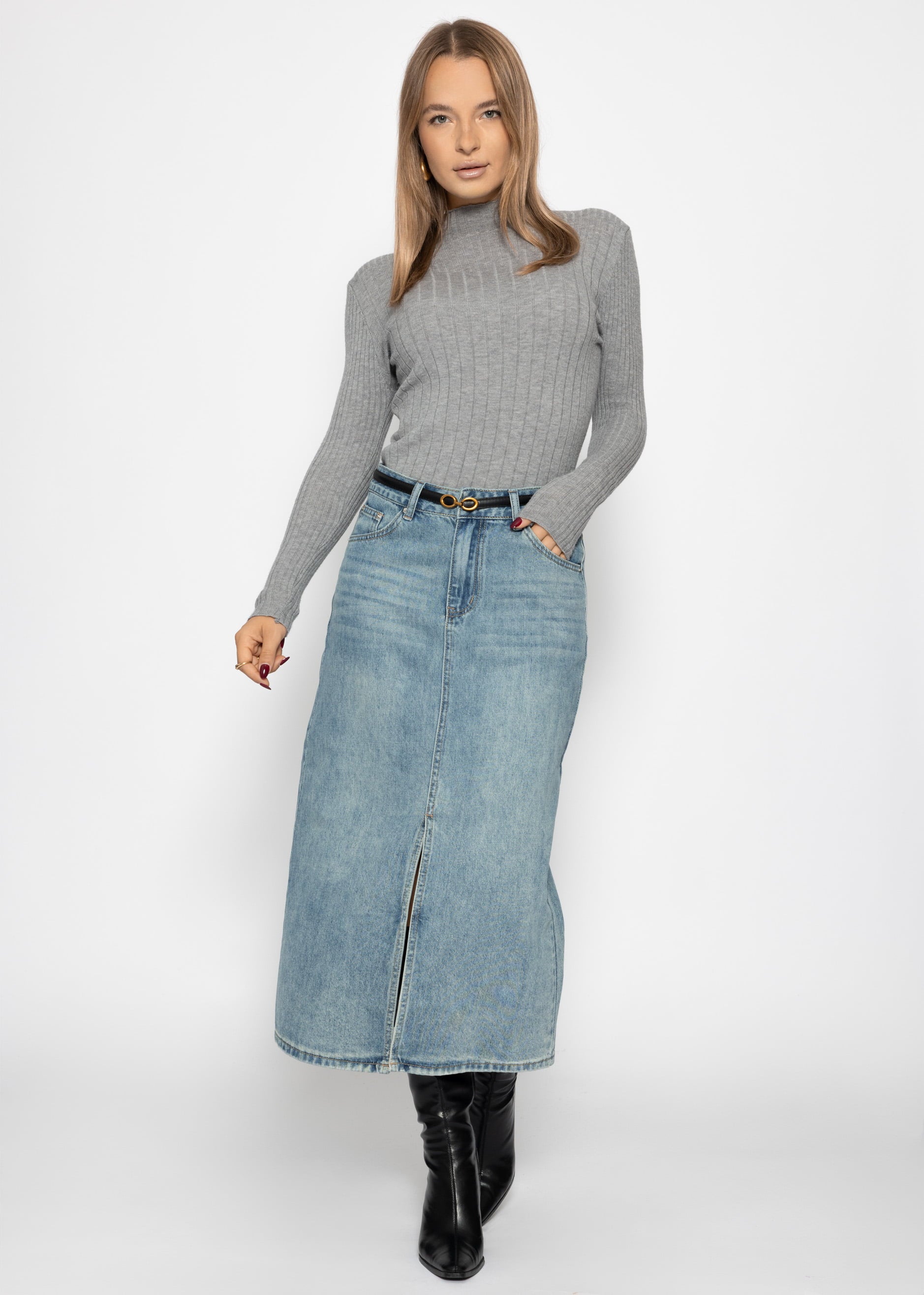Dieser Jeansrock vereint traditionellen Denim-Stil mit modernen Elementen. Der 5-pocket-style, der Knopf- und Reißverschluss sowie die Gürtelschlaufen verleihen dem Modell klassische, funktionale Details, während die hohe Taille und die Midi-Länge aktuelle Trends widerspiegeln. Der auffällige Schlitz an der Vorderseite sorgt für Bewegungsfreiheit und erzeugt eine verspielte Note. Dieser vielseitige Rock lässt sich perfekt mit einem schönen Top und Schlappen für einen lässigen Alltagslook kombinieren.