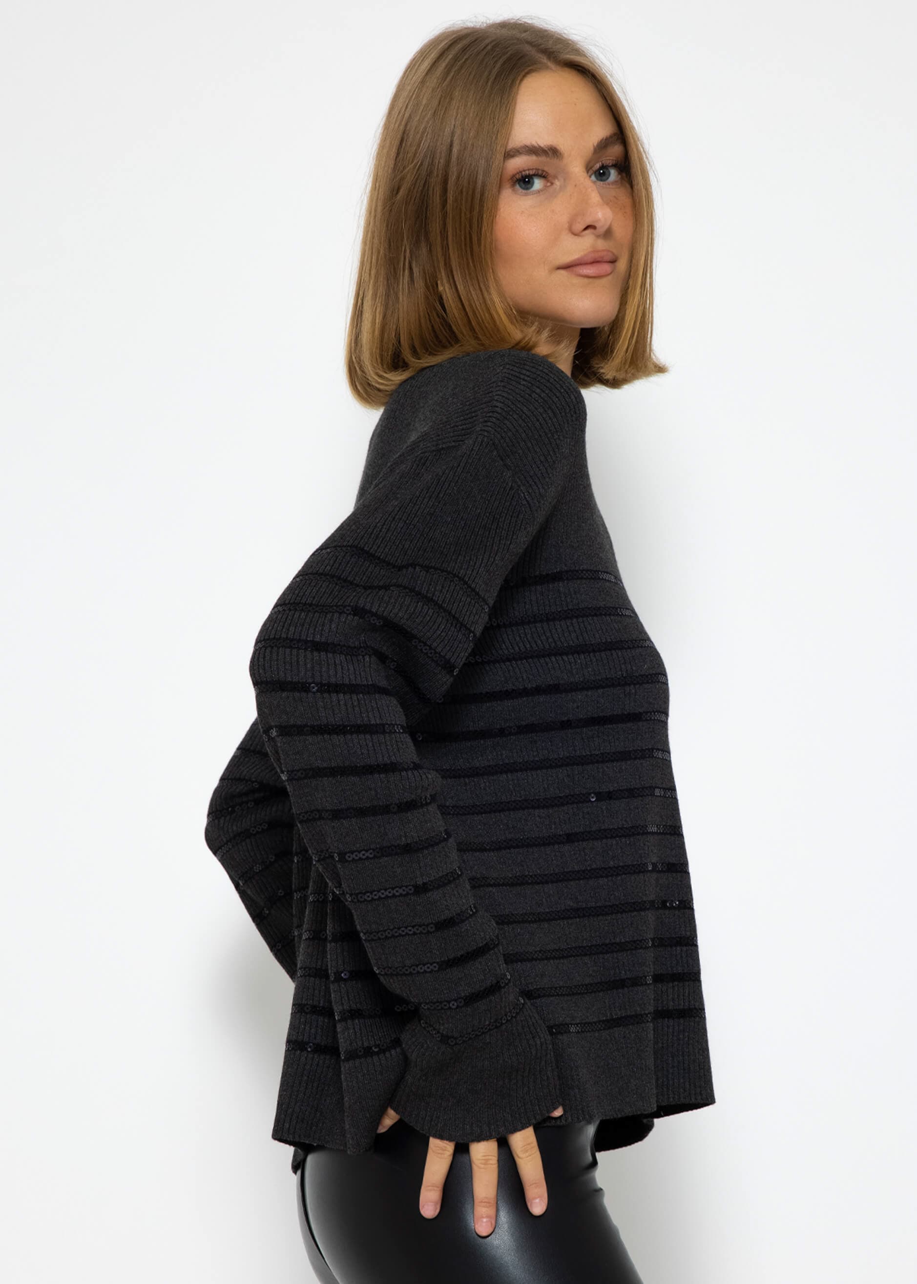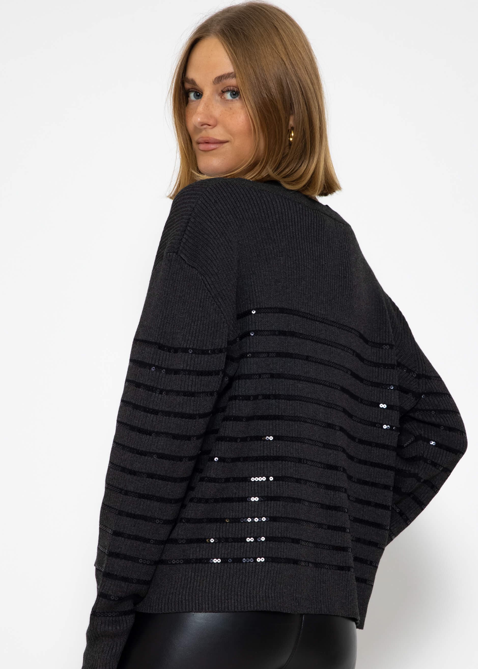 Pullover mit Pailletten Streifen in Dunkelgrau