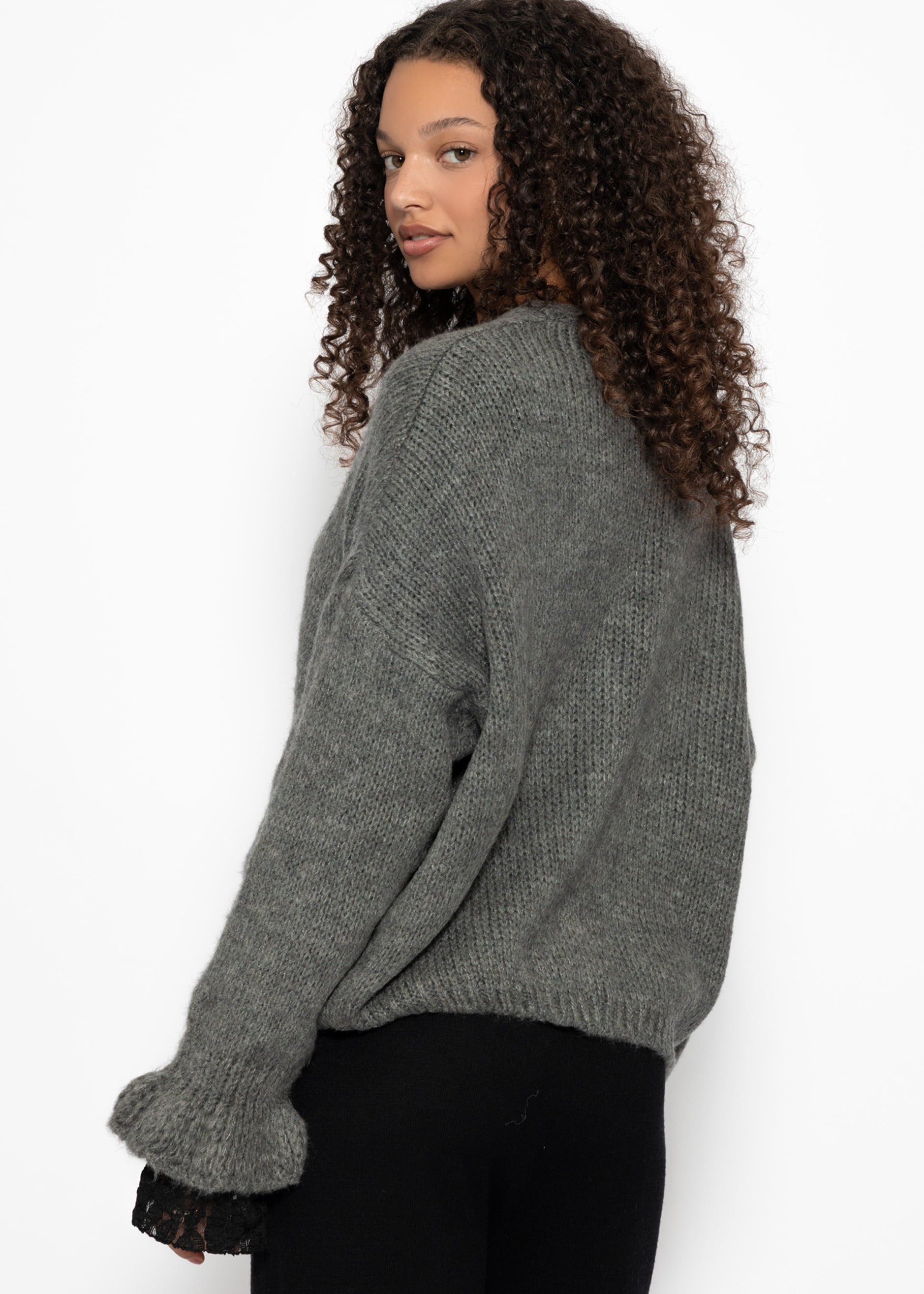This cardigan impresses with its casual fit and cozy knit. The long sleeves with flounces give the style a feminine touch and a slightly balloon-like silhouette.
