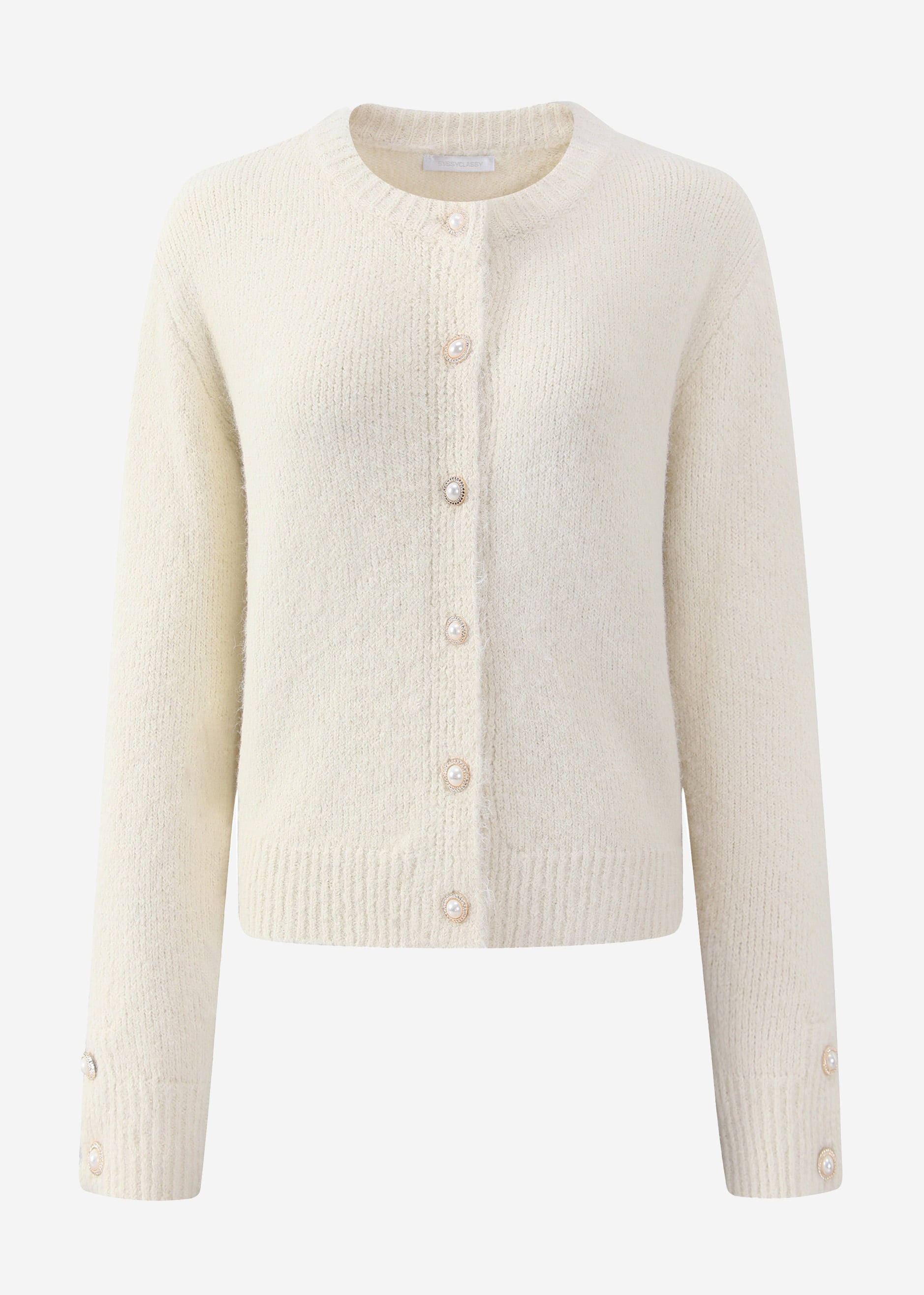 This slightly loose-fitting cardigan combines casual comfort with elegant accents. Crafted from a soft, fluffy knit, it feels pleasant against the skin and offers a relaxed silhouette. The elegant pearl buttons on the cuffs and along the front are a special eye-catcher and add a luxurious touch to the design. Thanks to its classic round neck and versatile style, it's the perfect choice for both everyday wear and special occasions.