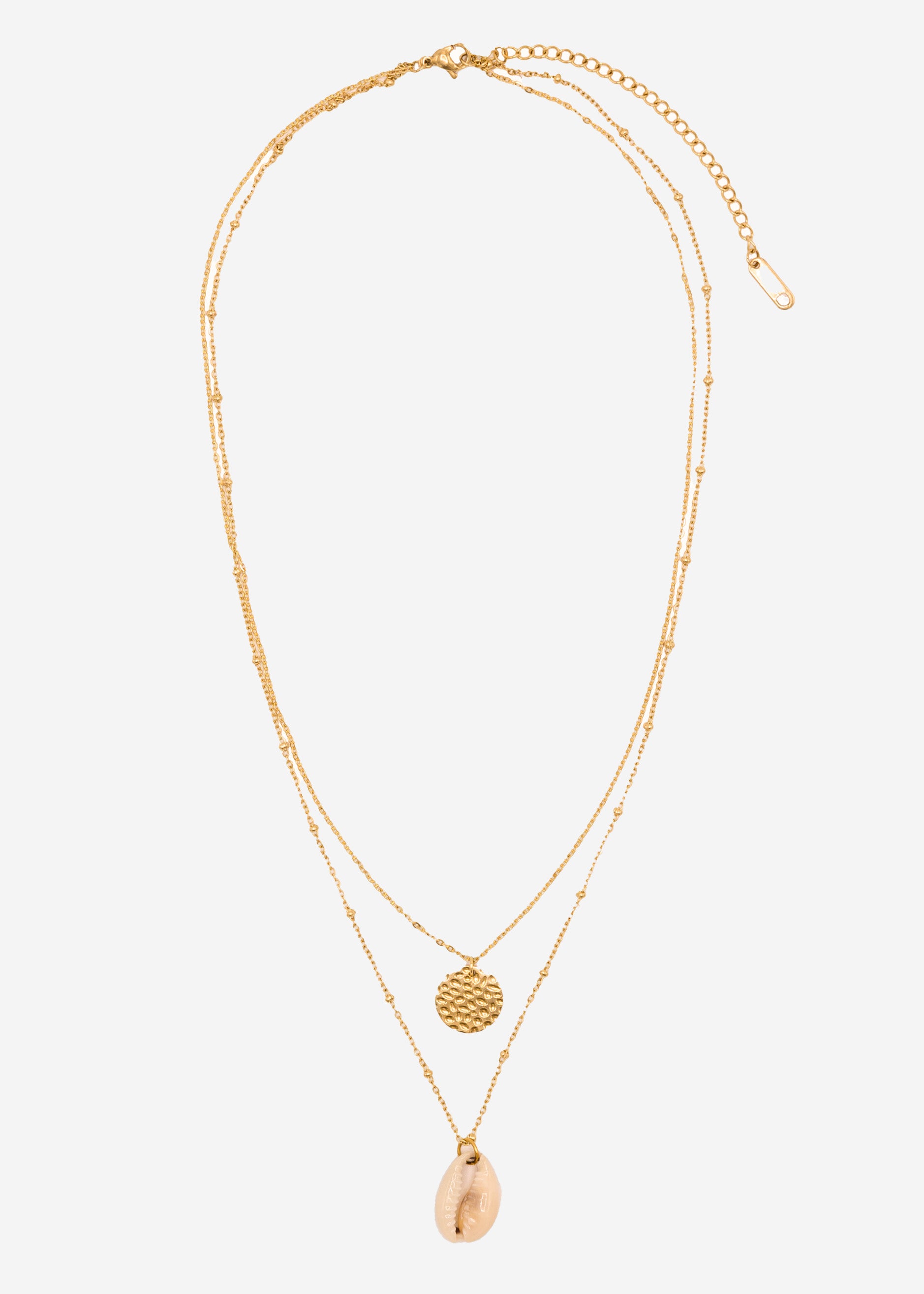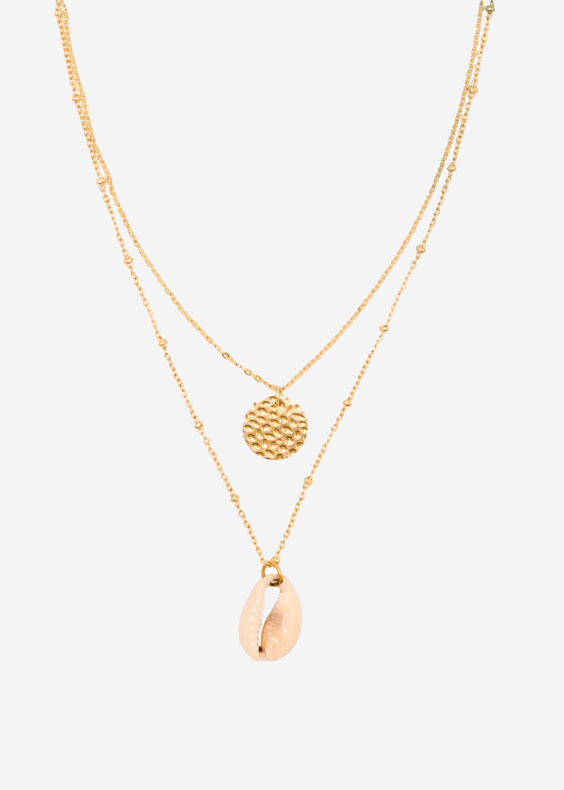 A combined necklace consisting of two delicate link chains of different lengths. A round, hammered pendant and an eye-catching shell complete the design. The chain is adjustable in length.