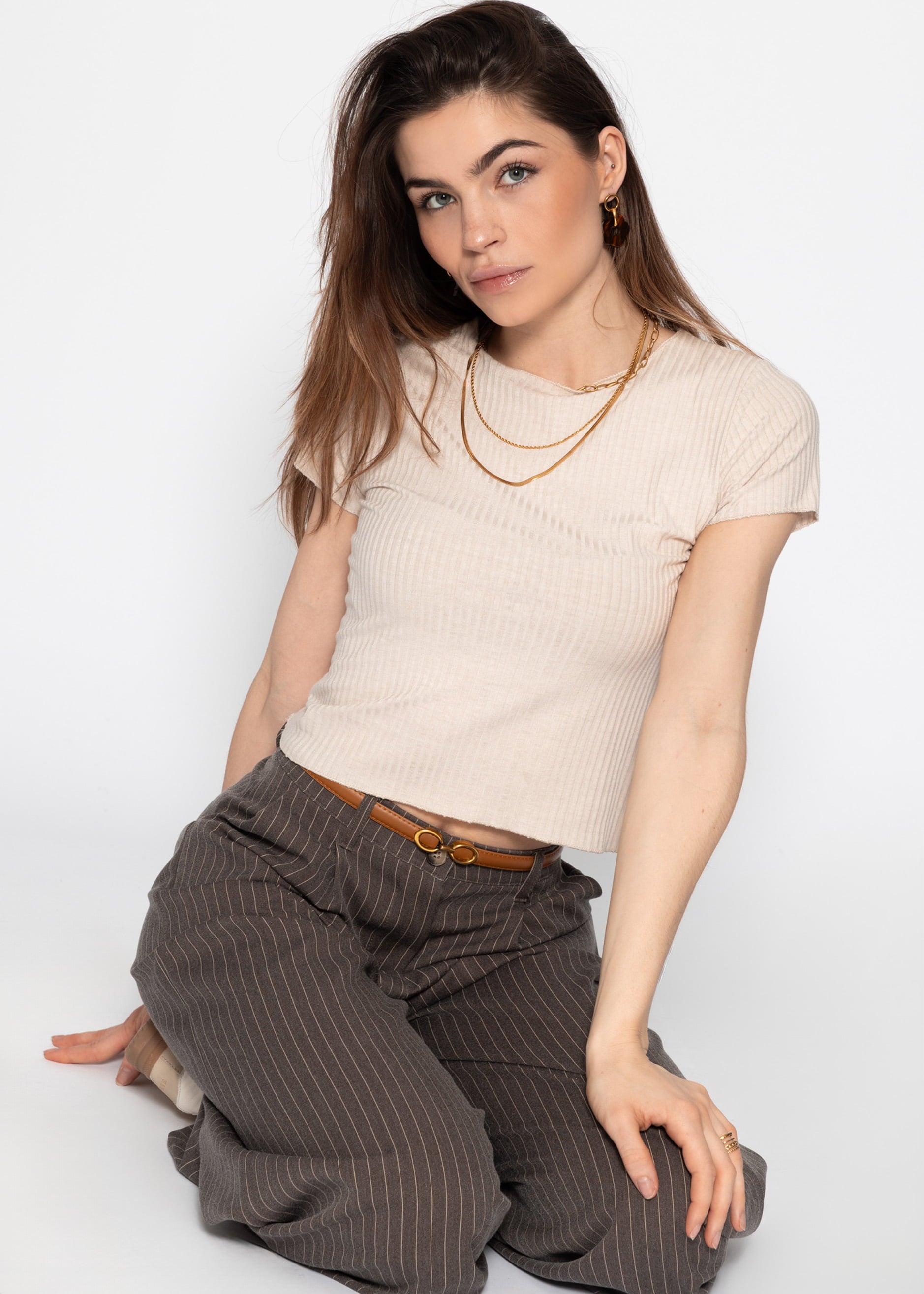 Short-sleeved shirt made of viscose rib jersey with a round neck.
