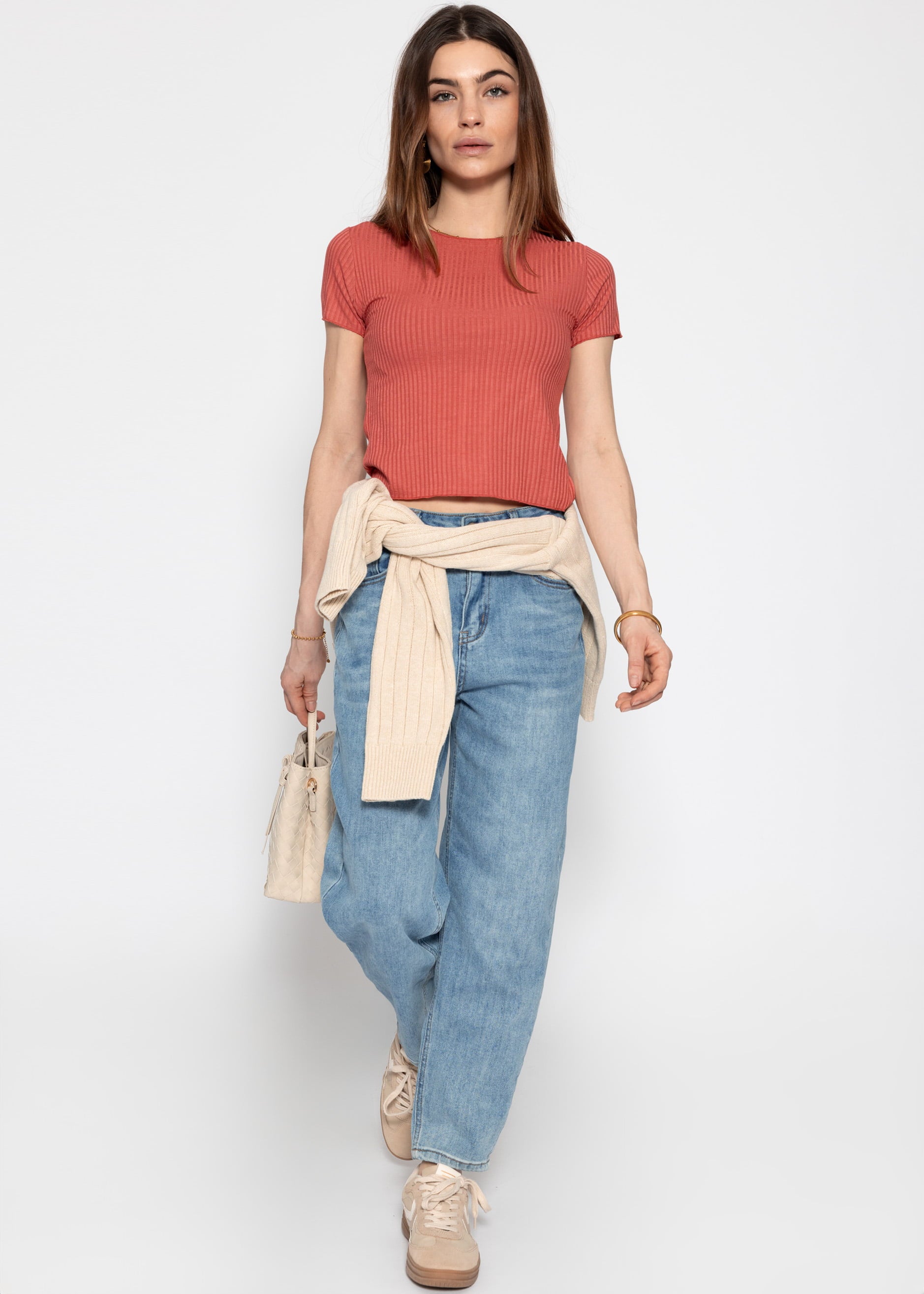 Short-sleeved shirt made of viscose rib jersey with a round neck.