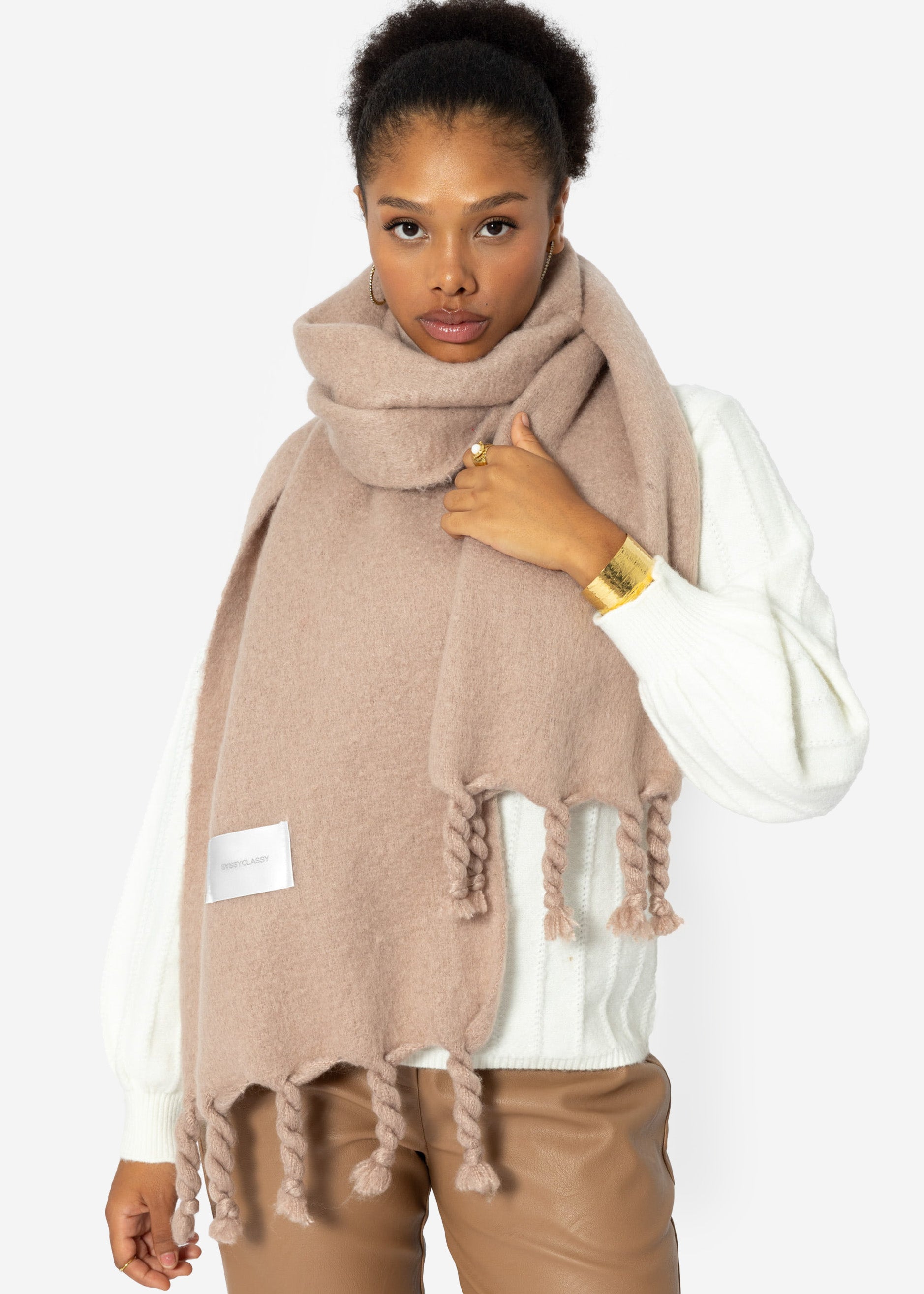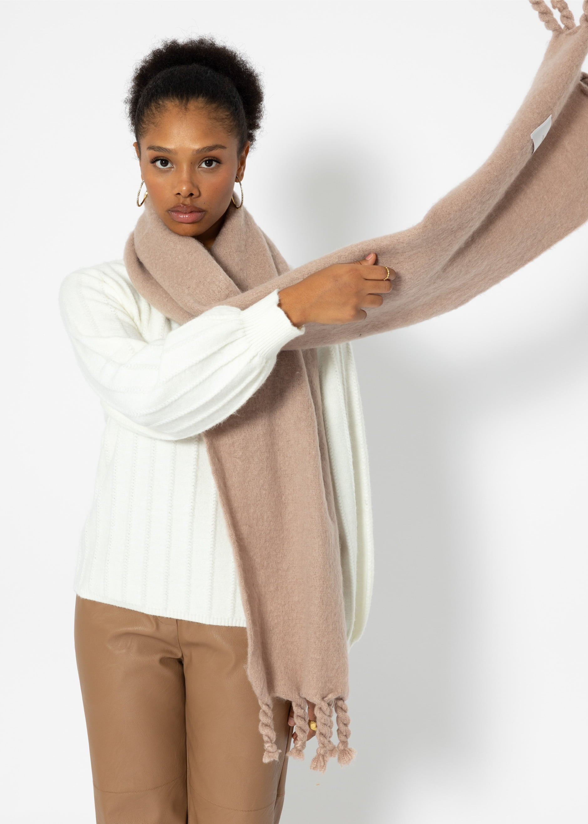 This scarf not only offers warmth and comfort, but also elevates your style to a new level. The model features a solid color design and fringed ends that add visual interest and a striking touch to your outfit. Made from a fluffy material, the scarf offers supreme comfort and protection on cold days. It features an elegant, high-quality label that adds a touch of luxury. This high-quality accessory tastefully combines elegance and functionality and will accompany you through the winter in style.