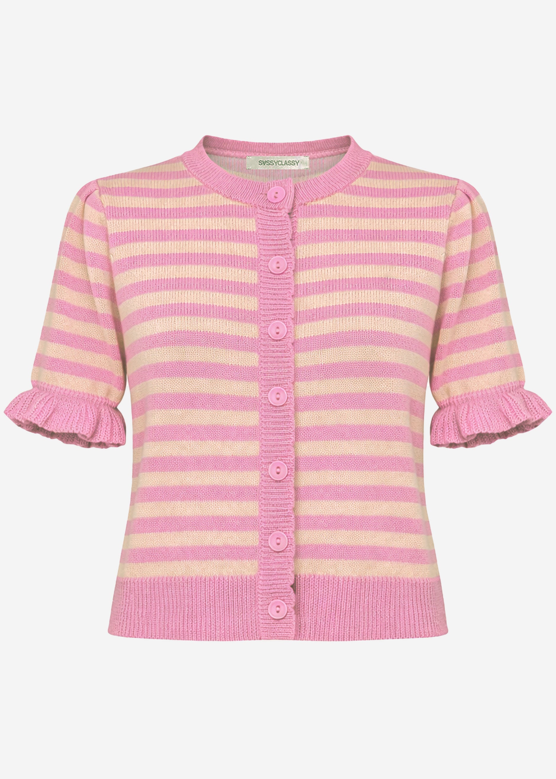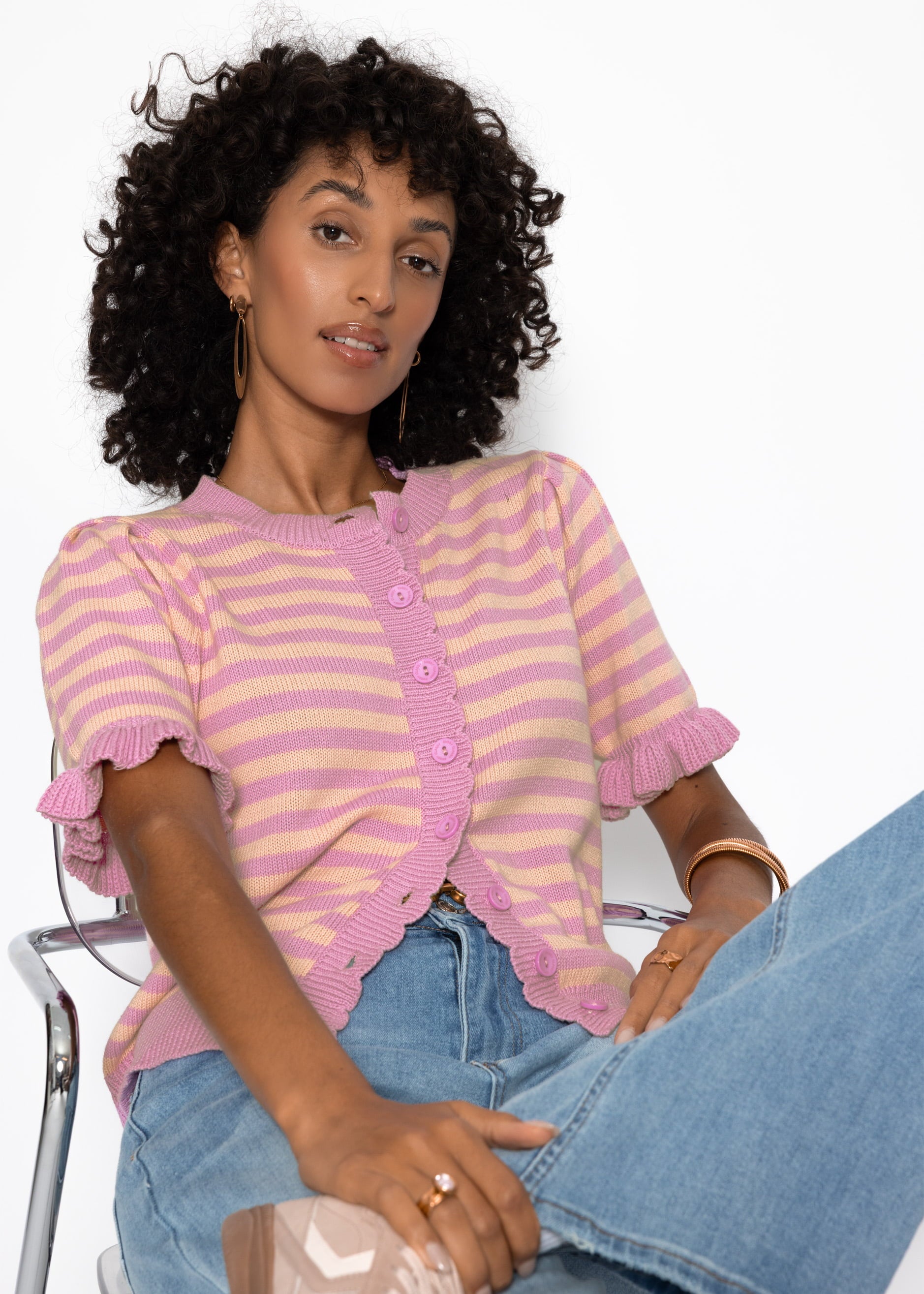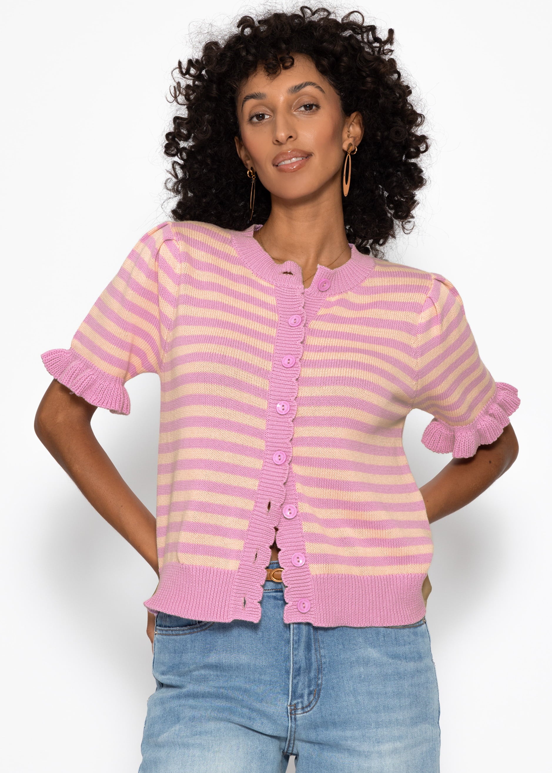 Kurzarm-Strickjacke mit zeitlosem Streifenmuster. Verspielte Volants an den Ärmelabschlüssen und eine durchgehende Knopfleiste mit Bogenkante verleihen dem Design eine feminine Note. Gerippte Bündchen an Saum und Rundhalsausschnitt sorgen für eine strukturierte, formstabile Passform.