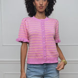 Gestreifte Kurzarm-Strickjacke mit Volants in Pink und Koralle