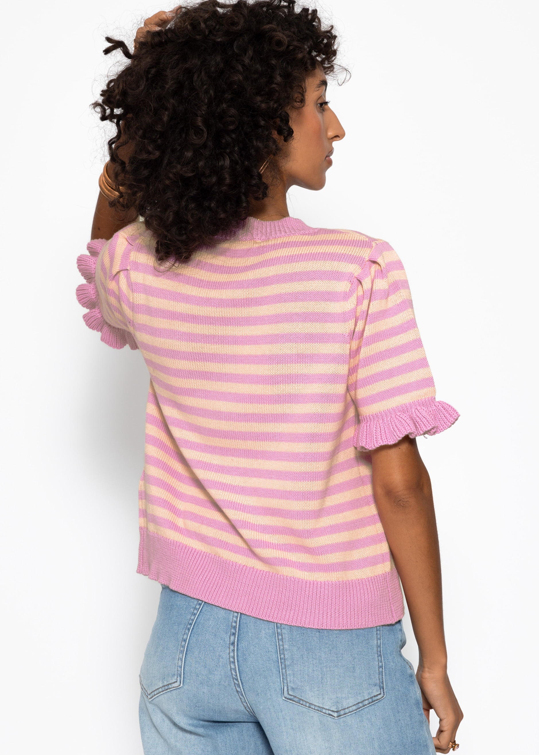 Gestreifte Kurzarm-Strickjacke mit Volants - pink-koralle
