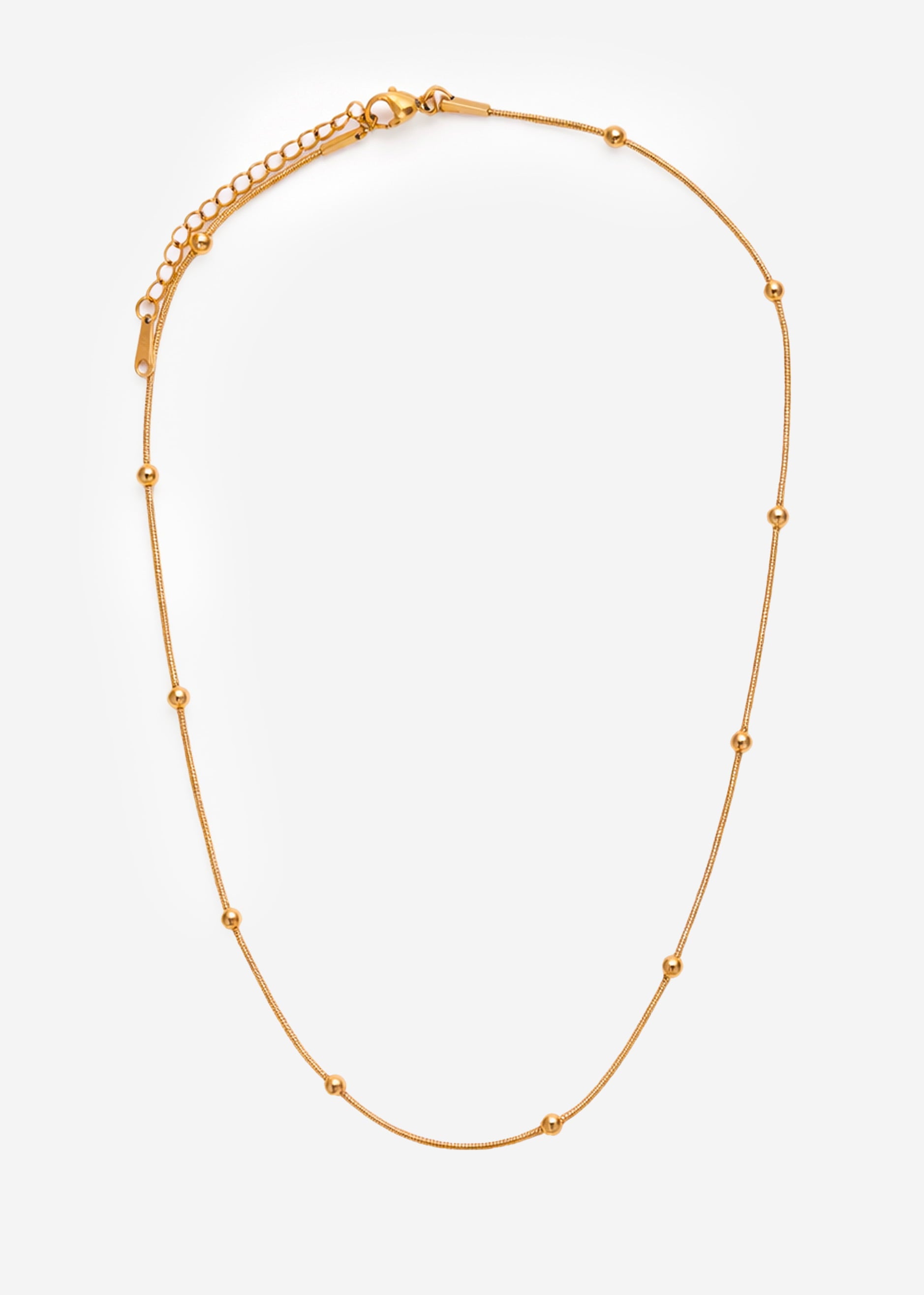Gold-tone necklace with a delicate link chain and incorporated bead details. The soft, evenly spaced beads add subtle accents and lend the piece an elegant lightness. Features a lobster clasp and extension chain for adjustable length.