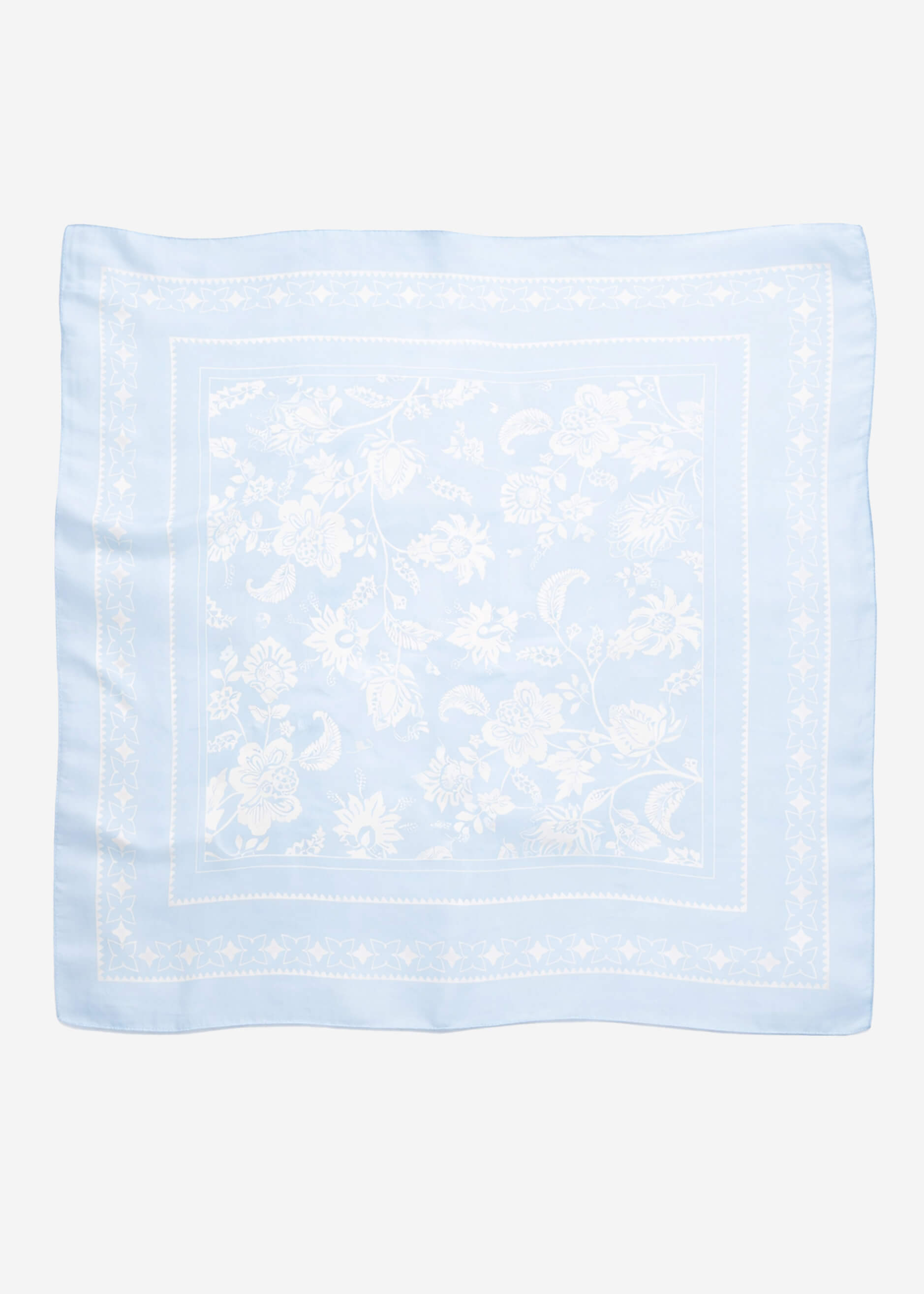 A delicate light blue scarf with a floral pattern and silk blend. The smooth, slightly lustrous fabric creates a high-quality, elegant look, while the detailed print lends the design a timeless touch. A sophisticated accessory with a pleasantly soft feel.
