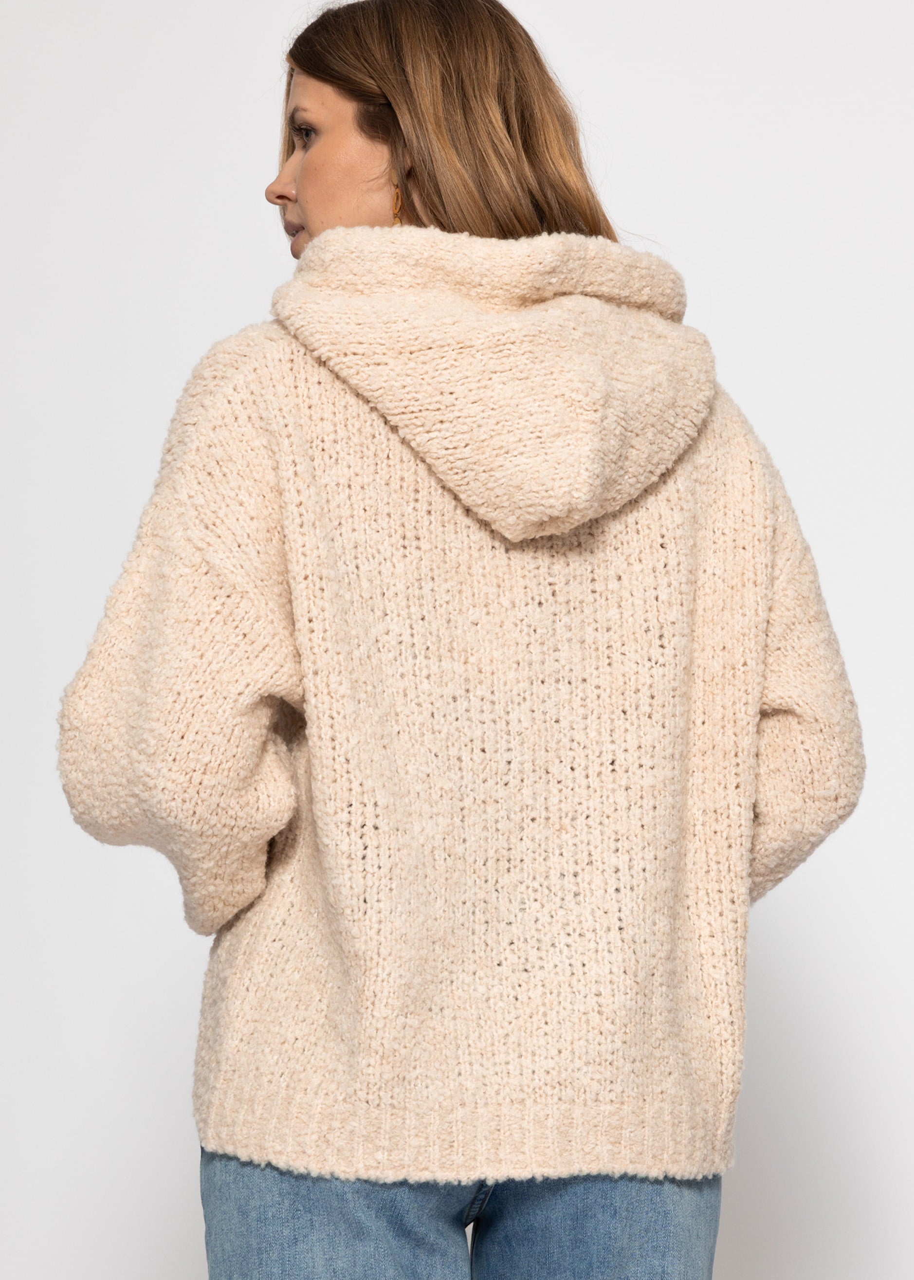 This cozy hoodie combines comfort with casual style. Crafted from soft bouclé knit, this hoodie offers pleasant warmth and a sophisticated look. The model features a relaxed fit and slightly dropped shoulders for a modern silhouette. The hood adds a casual touch to the design, while the ribbed cuffs and hem add structure. The hoodie is versatile and can be worn with jeans, leggings, or trendy faux leather pants.