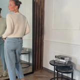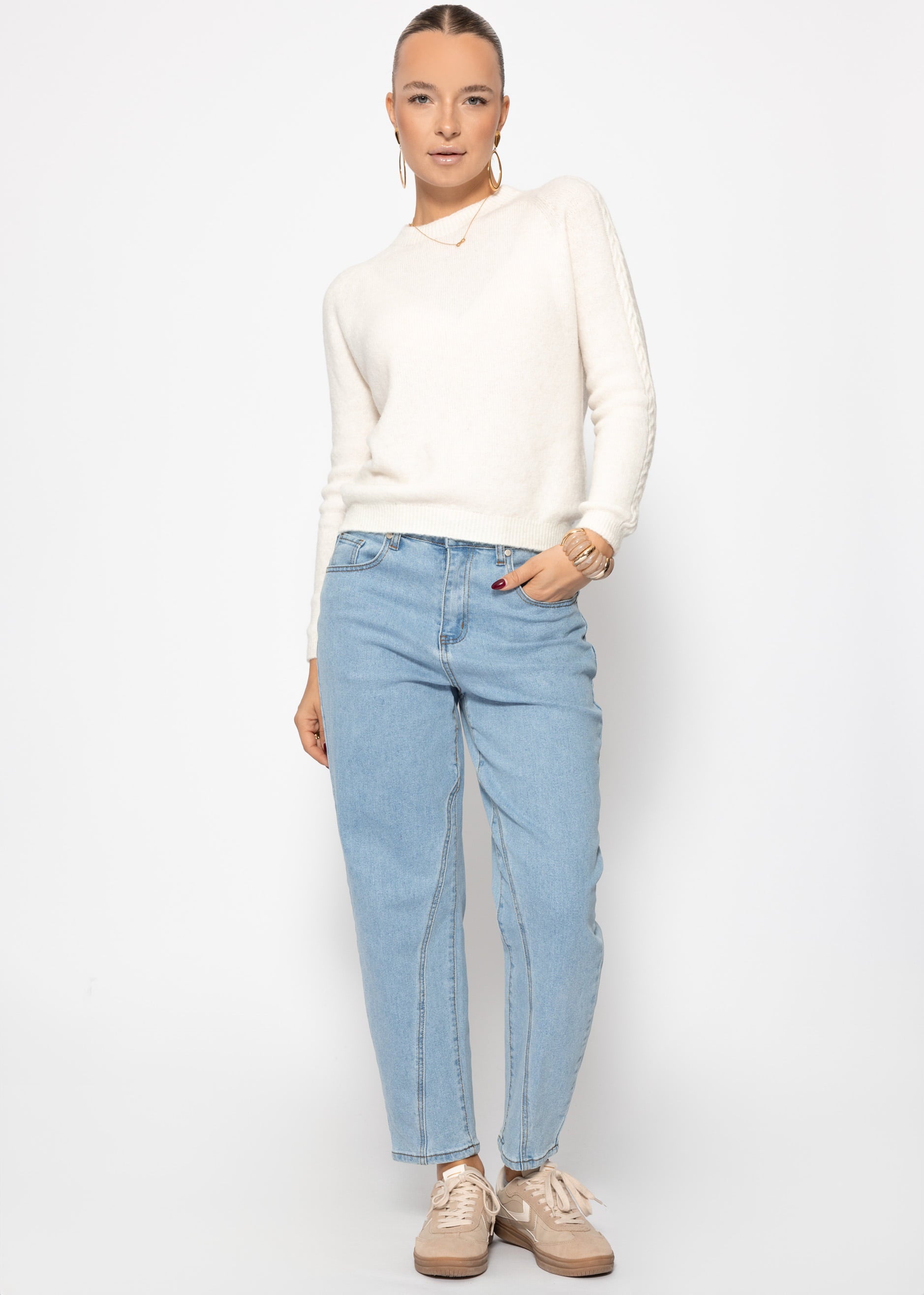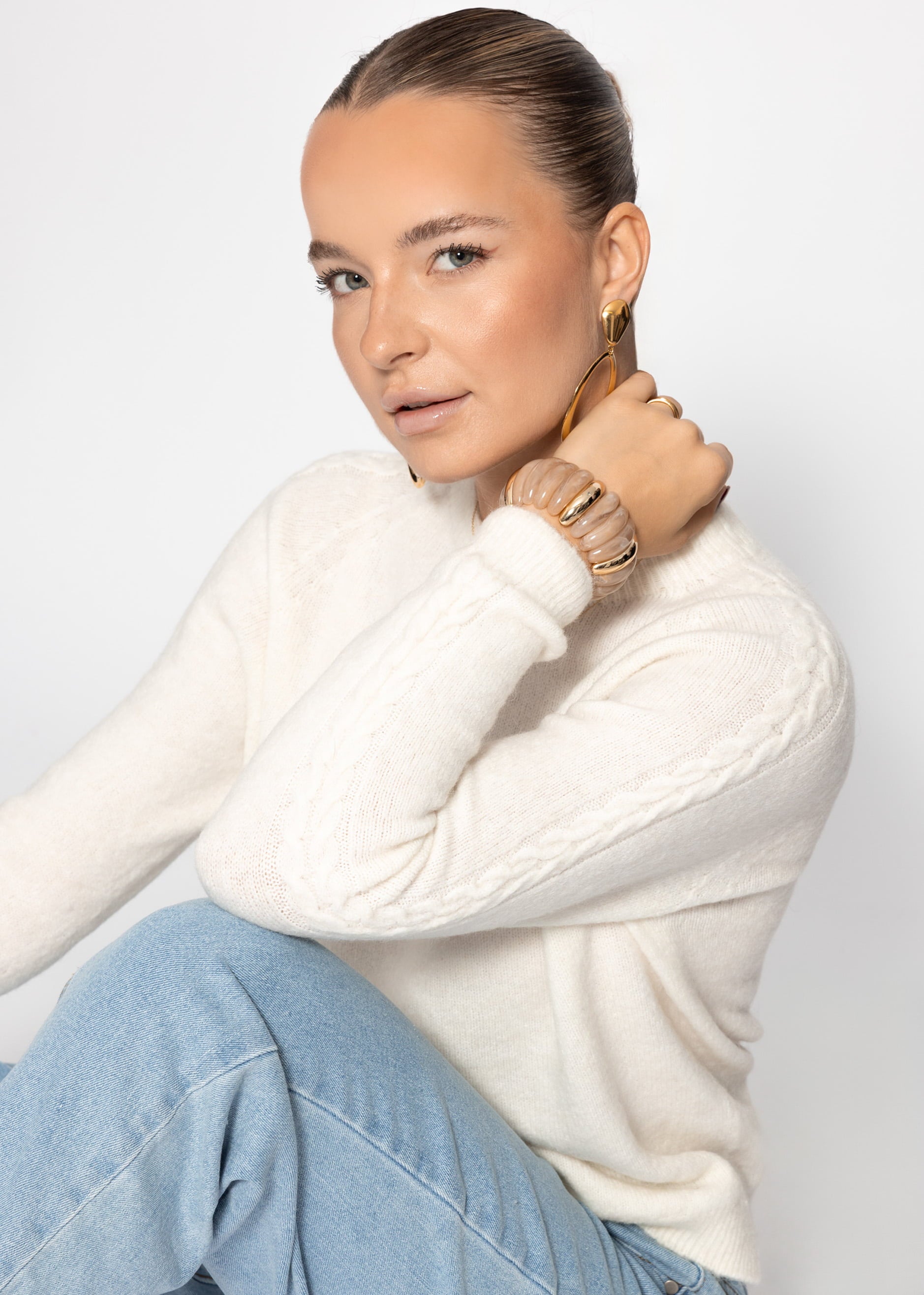 This knit sweater in Off-white is the perfect basic for elegant everyday looks. The delicate fine knit with a subtle cable pattern along the sleeves adds a sophisticated, feminine touch—ideal for the office, leisure time, or date night. The soft feel and casual cut offer maximum comfort, while the round neckline creates a classic, modern look. An essential that you can style all year round! Perfectly combinable with jeans, skirts, or trousers—popular with women who love minimal chic and cozy elegance.