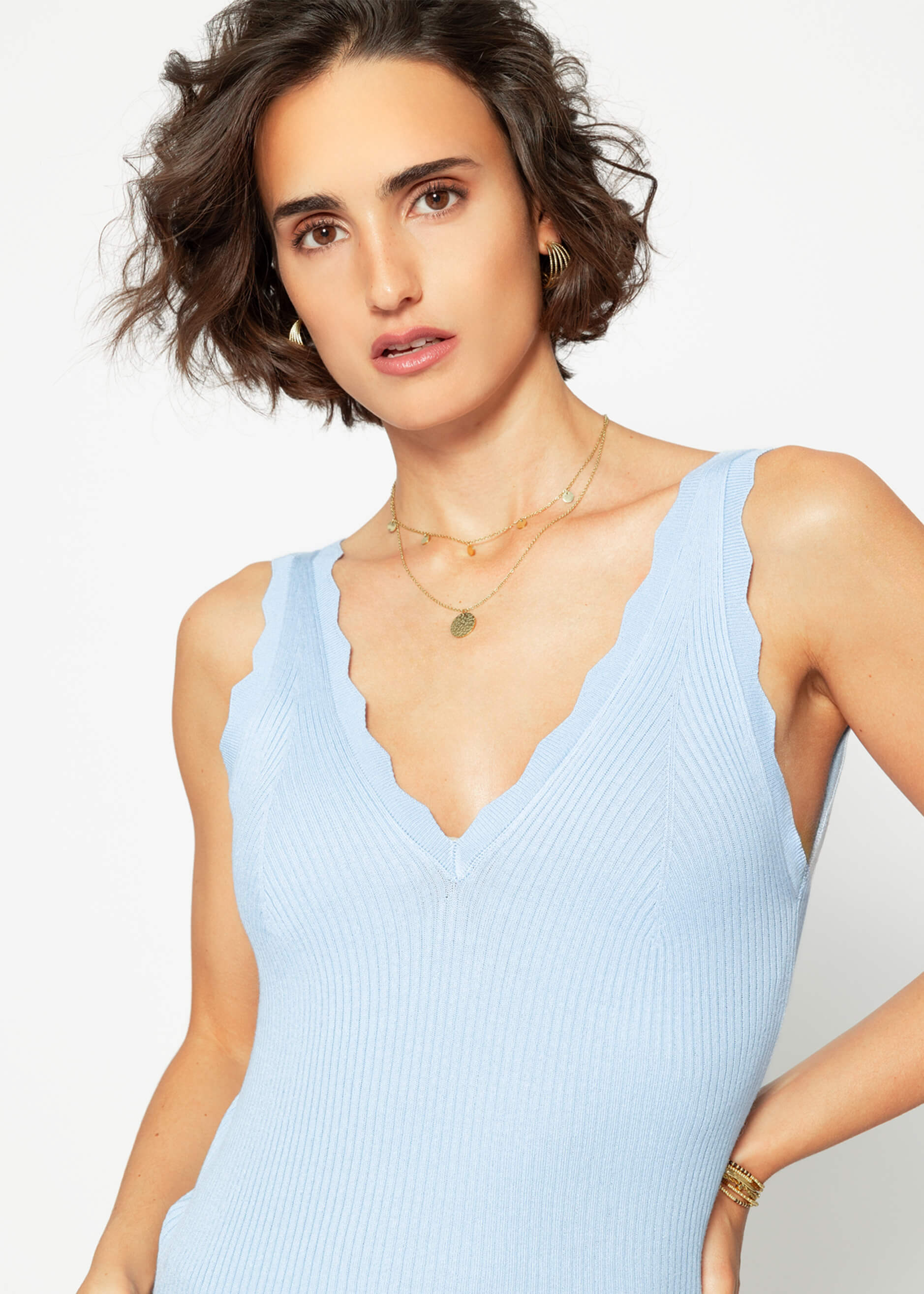 Fine knit top in viscose rib. Scalloped edges at the V-neck and armholes give this summer top a feminine touch.