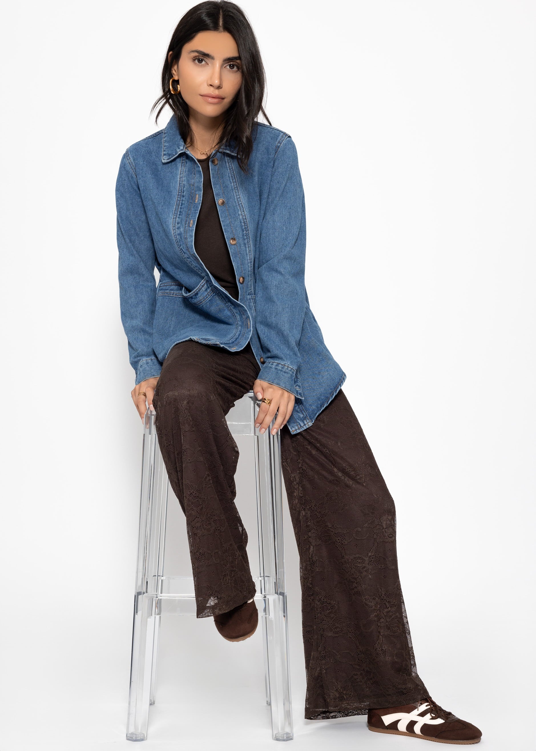 These brown lace pants combine elegance and casualness in a modern design. The delicate lace material adds a feminine touch to the look, while the wide leg creates a flowing, flattering silhouette. Thanks to the full lining, the pants are opaque and comfortable to wear—ideal for stylish outfits with a comfort factor. The elastic waistband offers additional support and comfort. Combined with the matching lace blouse, they create a harmonious, trendy look.