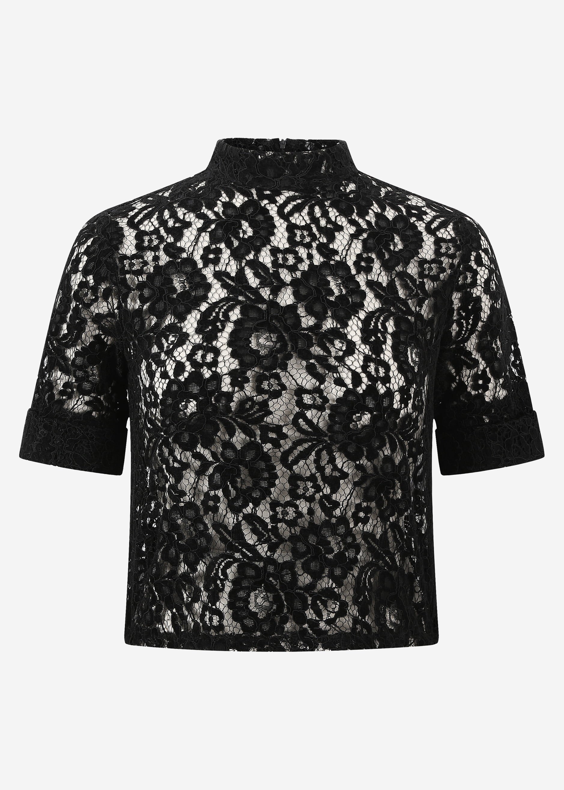 This elegant lace top combines romance with modern style. The style features a floral pattern on sheer lace for a feminine look, while the velvet effect on the blossoms creates a luxurious texture. The top features short sleeves and a high round neckline for a classic touch. The semi-sheer design subtly reveals the skin, creating a charming contrast. The back zipper makes it easy to put on and take off and completes the design. You can wear this top for both formal occasions and a chic evening look.
