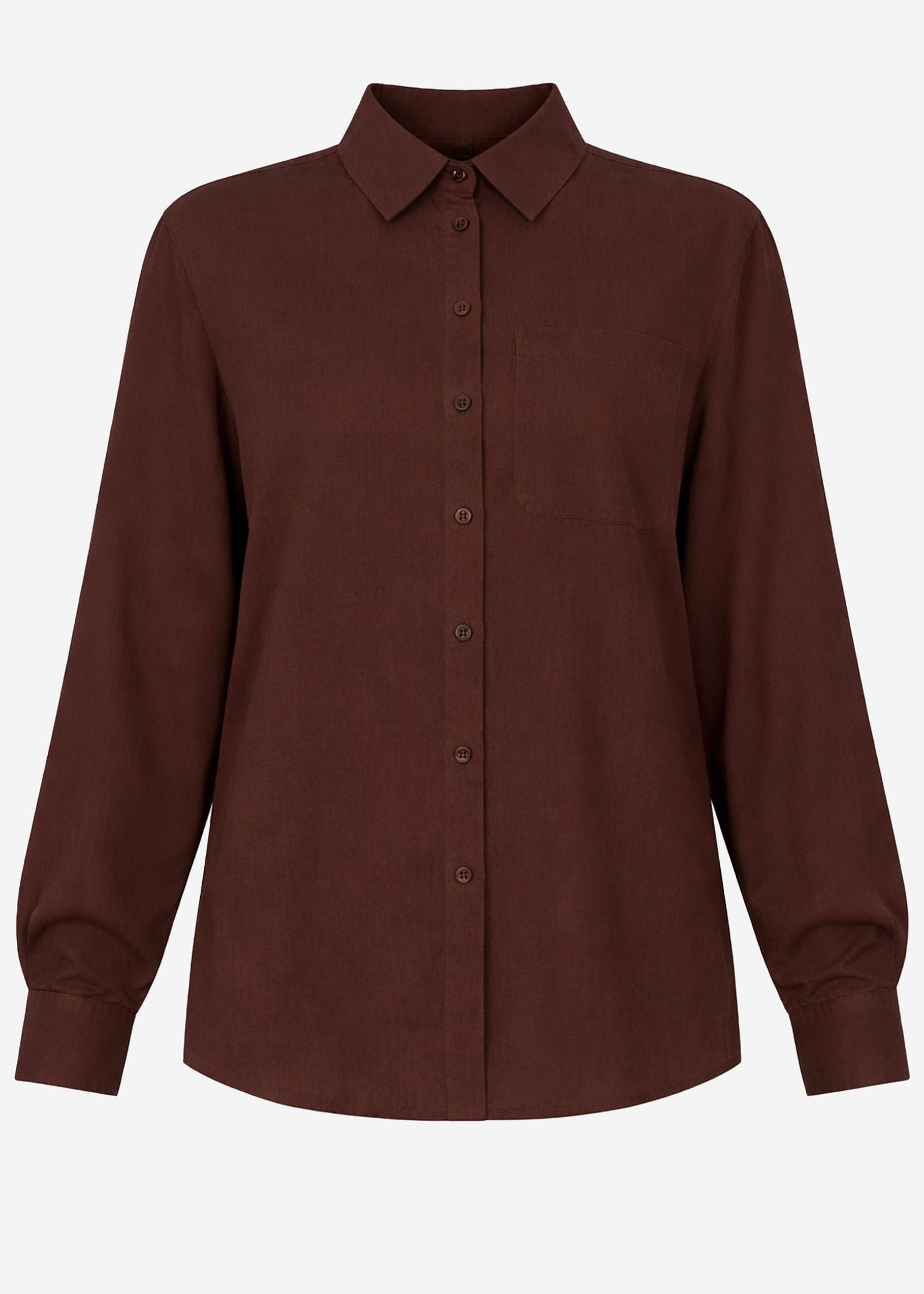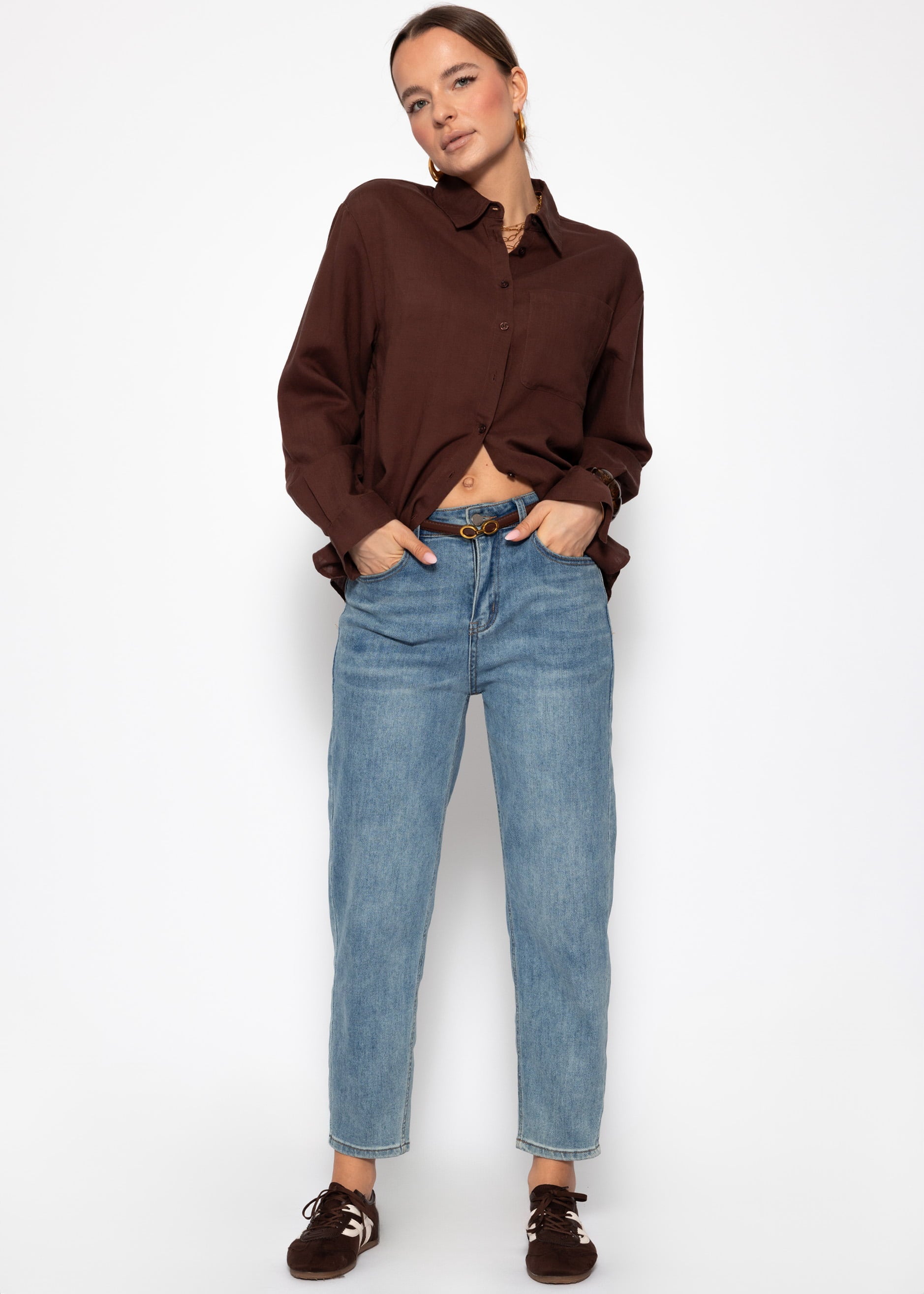 This airy, light shirt blouse made of high-quality linen mix impresses with its relaxed, yet stylish look. The loosely cut fit with a classic shirt collar, continuous button placket and patch on the breast pocket gives the blouse a timeless character. It is therefore perfect for casual summer looks or relaxed office outfits. The long sleeves with cuffs provide an elegant silhouette, while the linen material ensures a comfortable fit. The back convinces in the clean look with a subtle shoulder adit. The design is supplemented by a rounded hem that falls loose and modern.