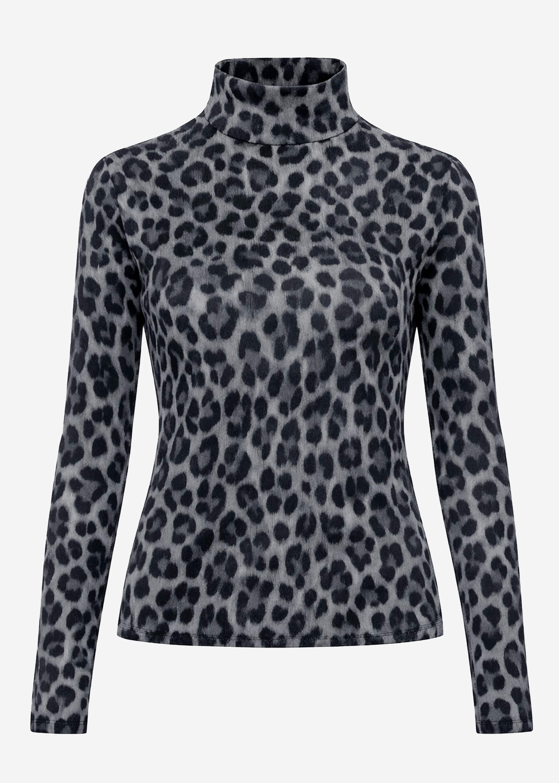 Leopard print long-sleeved shirt with a narrow stand-up collar and figure-hugging silhouette. Soft, slightly stretchy material for comfortable wear. Perfect as a statement piece for layered looks.