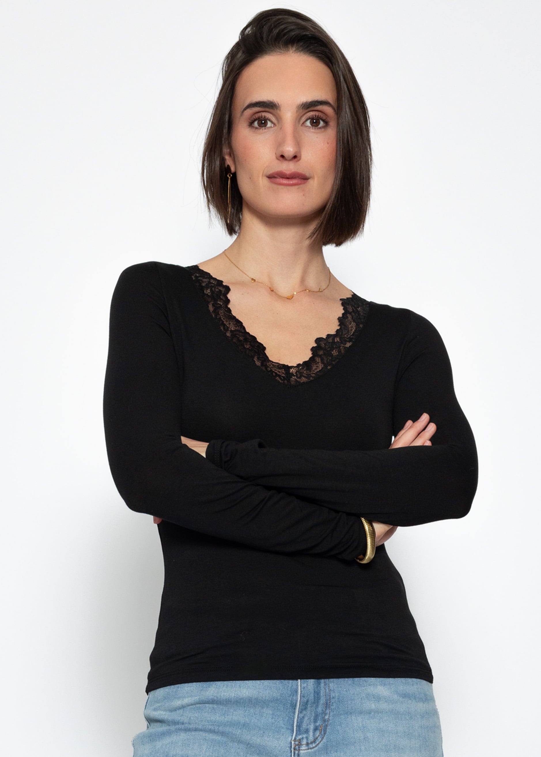 Black long-sleeved top with an elegant lace neckline for a feminine, timeless look. The delicate lace adds a stylish accent and lends a special touch to the simple design. Ideal for elegant everyday outfits or as a sophisticated basic to mix and match.