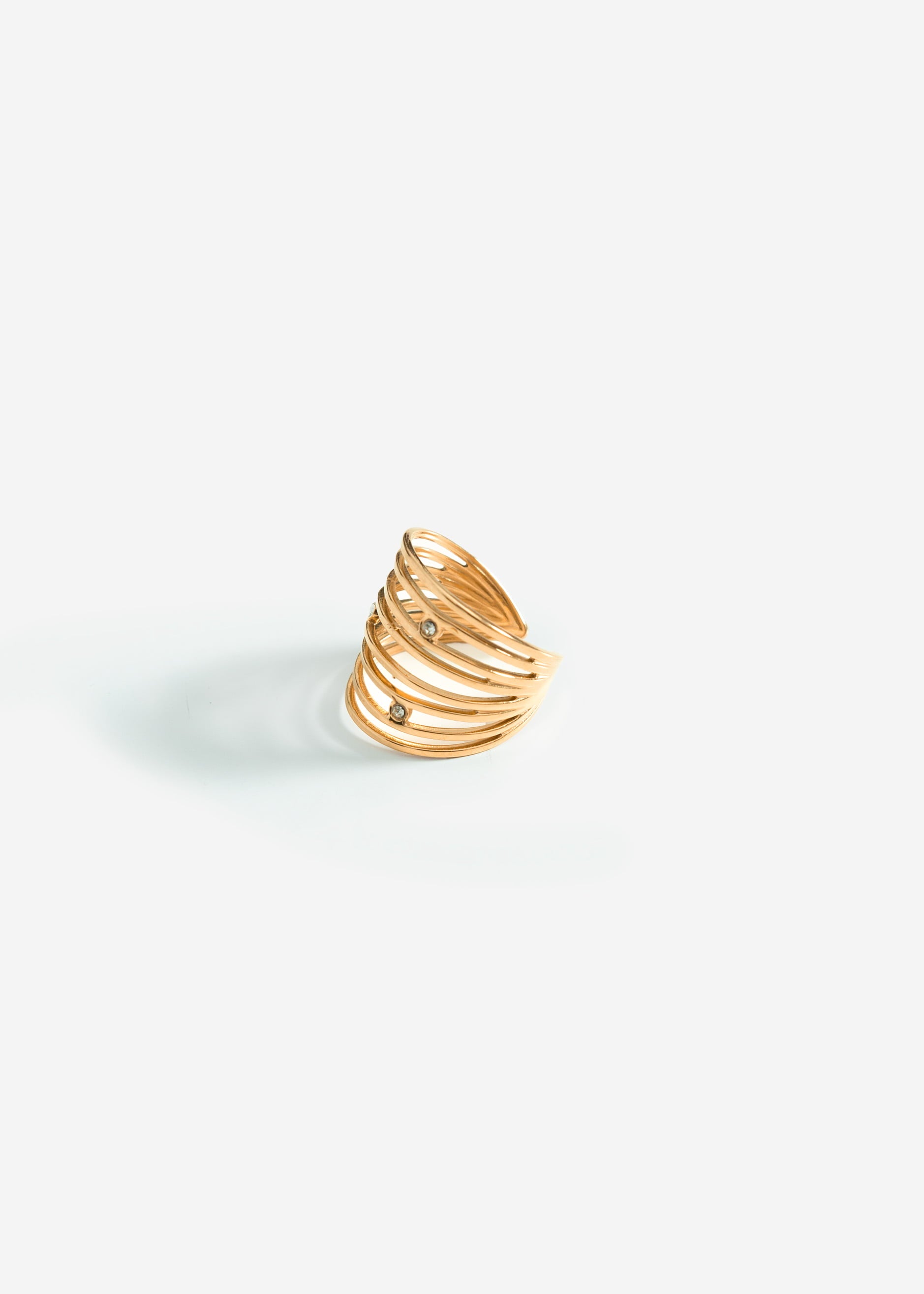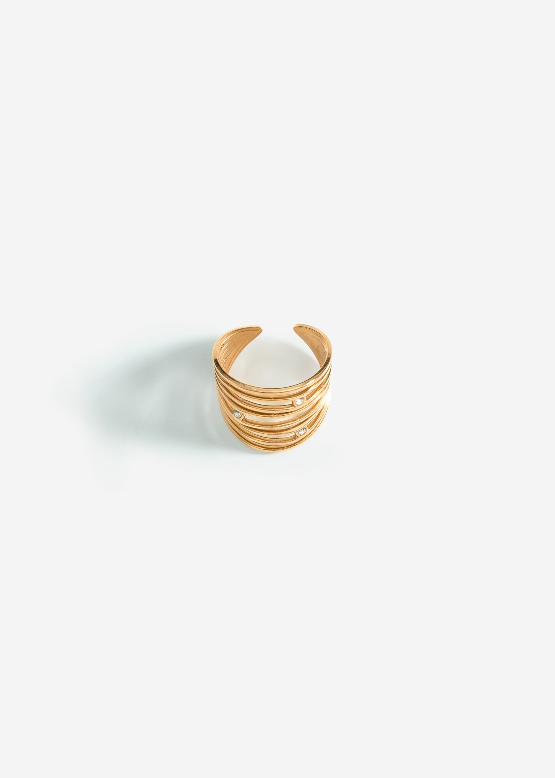 The gold-colored ring in a multi-row design features delicately offset stones that shimmer gently in the light. The elegant interplay of shine and texture gives this piece of jewelry a modern, feminine elegance. The open design gives the ring a modern and light appearance, while the shiny finish adds a touch of elegance to any look - a stylish accessory that can be easily combined with other pieces.