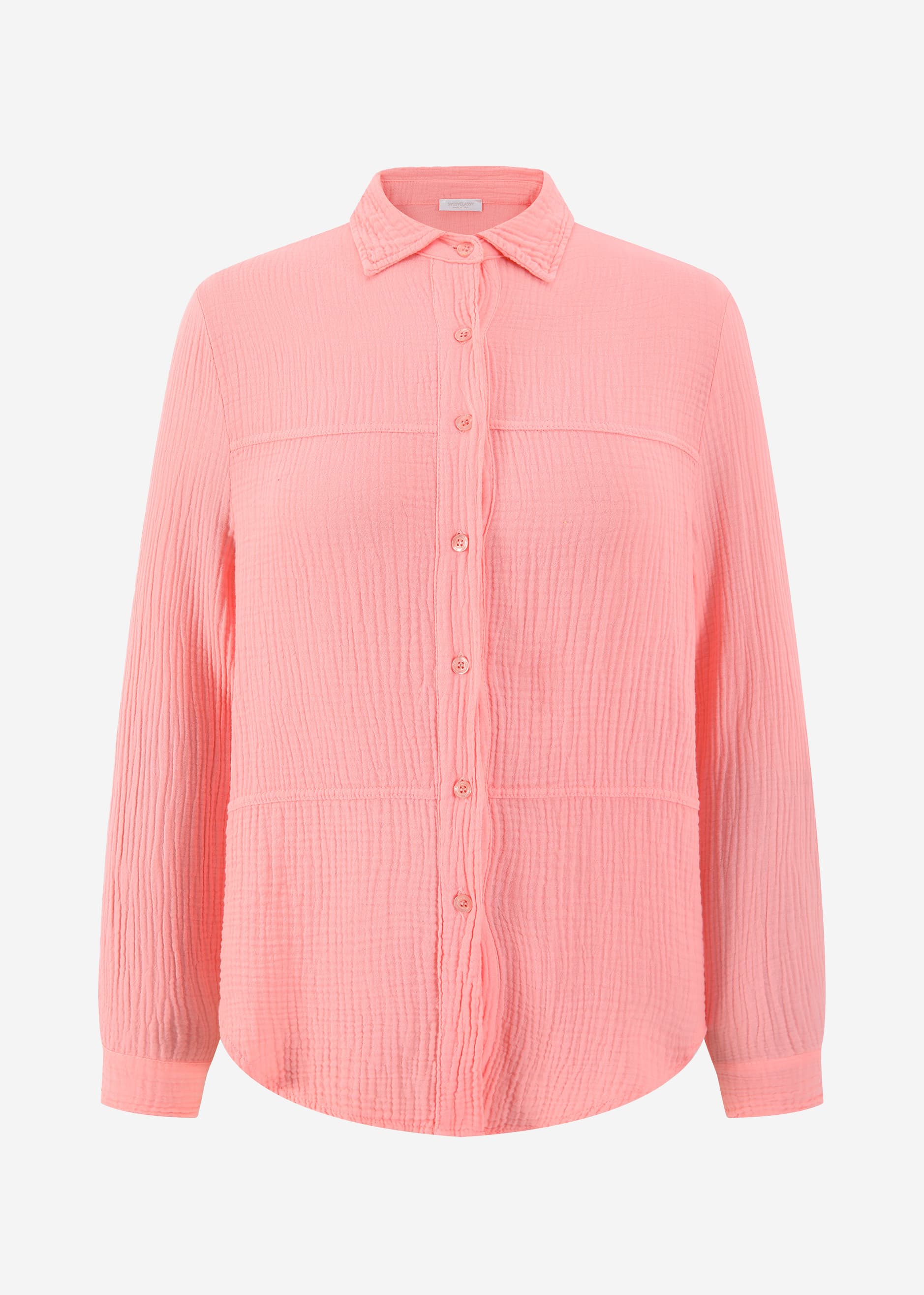 This new muslin creation is a must-have in your wardrobe this season. The subtle decorative seams create a striking design element that adds structure and depth. The style features classic details such as a collar, button placket, and cuffs on the long sleeves. The loose fit creates a relaxed silhouette, while the blouse's soft cotton material guarantees a comfortable, lightweight feel. A subtle SASSYCLASSY patch is located at the end of the button placket, symbolizing quality and exclusivity. This muslin blouse can be effortlessly integrated into any look, whether with rolled-up sleeves and casual trousers for a relaxed occasion or combined with smart trousers for a professional appearance.