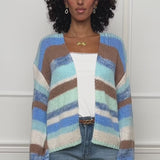 Striped cardigan in a harmonious mix of blue, off-white, and camel. Open design with no closure, relaxed drape, and long sleeves for a casual look. Soft knit texture with wide stripes – ideal for cozy layering for everyday wear and leisure.