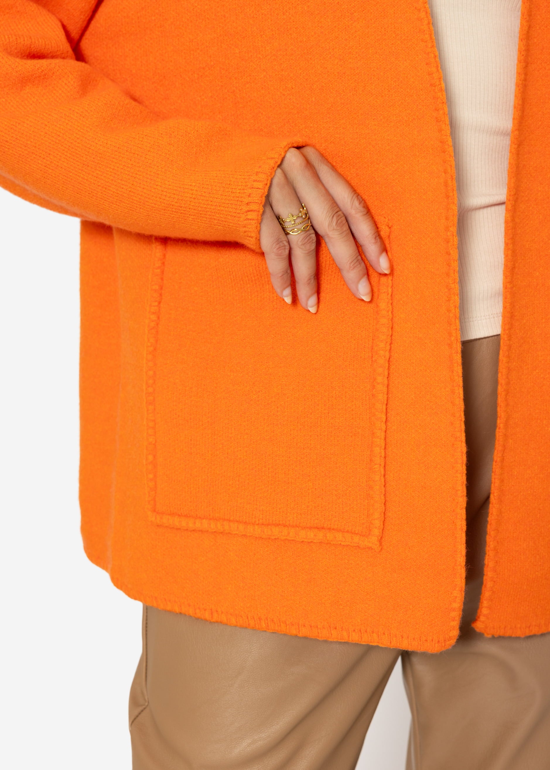 This cardigan impresses with its simple elegance and comfortable fit. It features a loose fit, long sleeves, and dropped shoulders. The open silhouette adds a casual touch to your look and allows for versatile layering. The two generous patch pockets are a highlight, lending the cardigan practical functionality as well as aesthetic appeal. The subtle tone-on-tone decorative borders running along the pockets and cuffs add elegant structure to the minimalist design. It's ideal for pairing with a simple top and jeans for a stylish everyday look.