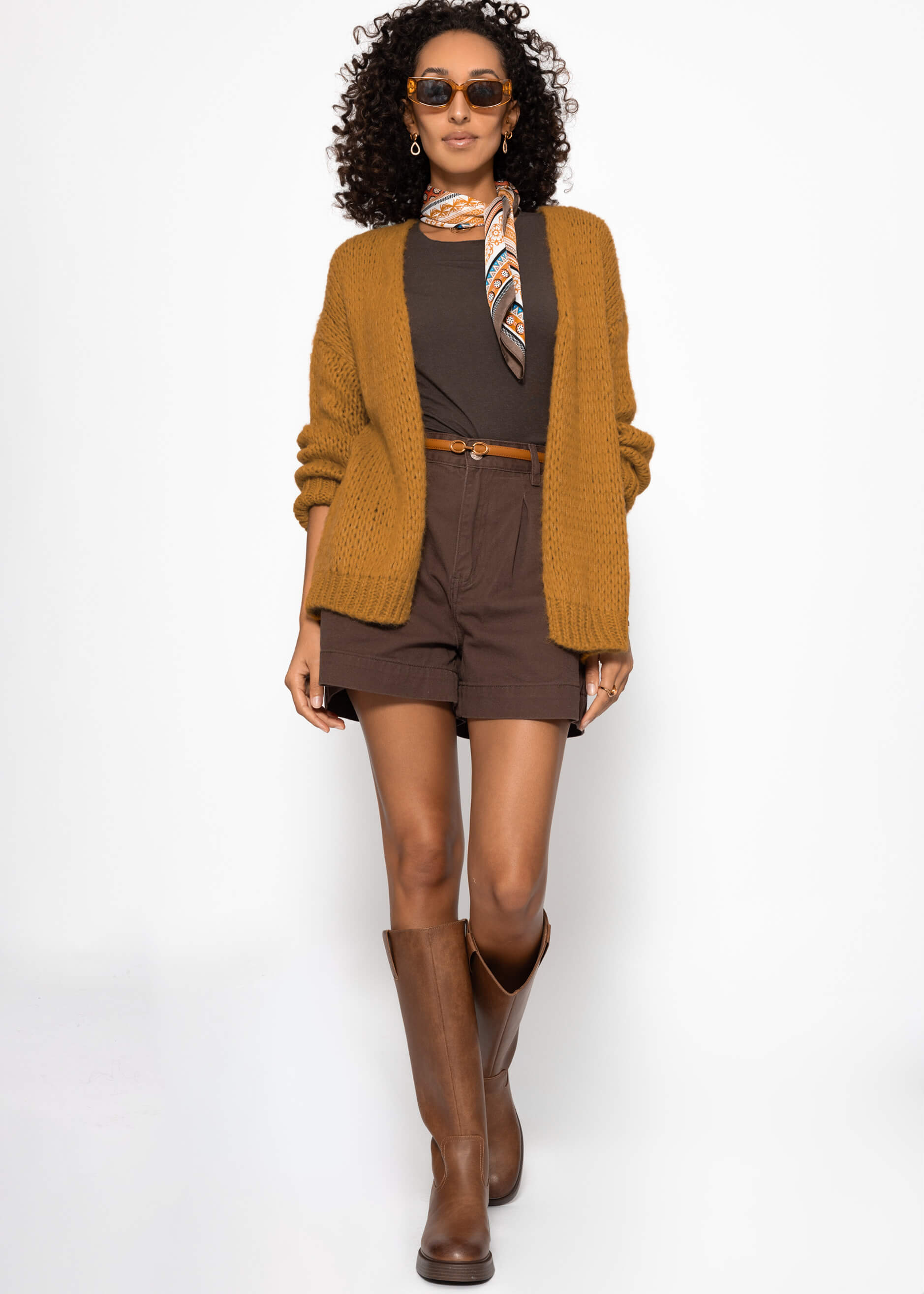 This cardigan made of fluffy rope presents itself in a trendy oversized fit with overcovered shoulders. The openly falling cut ensures nonchalance. Ripp cuffs and a ribbed hem skillfully complete the design. This piece of clothing is an essential piece for your wardrobe and can be combined in many ways.