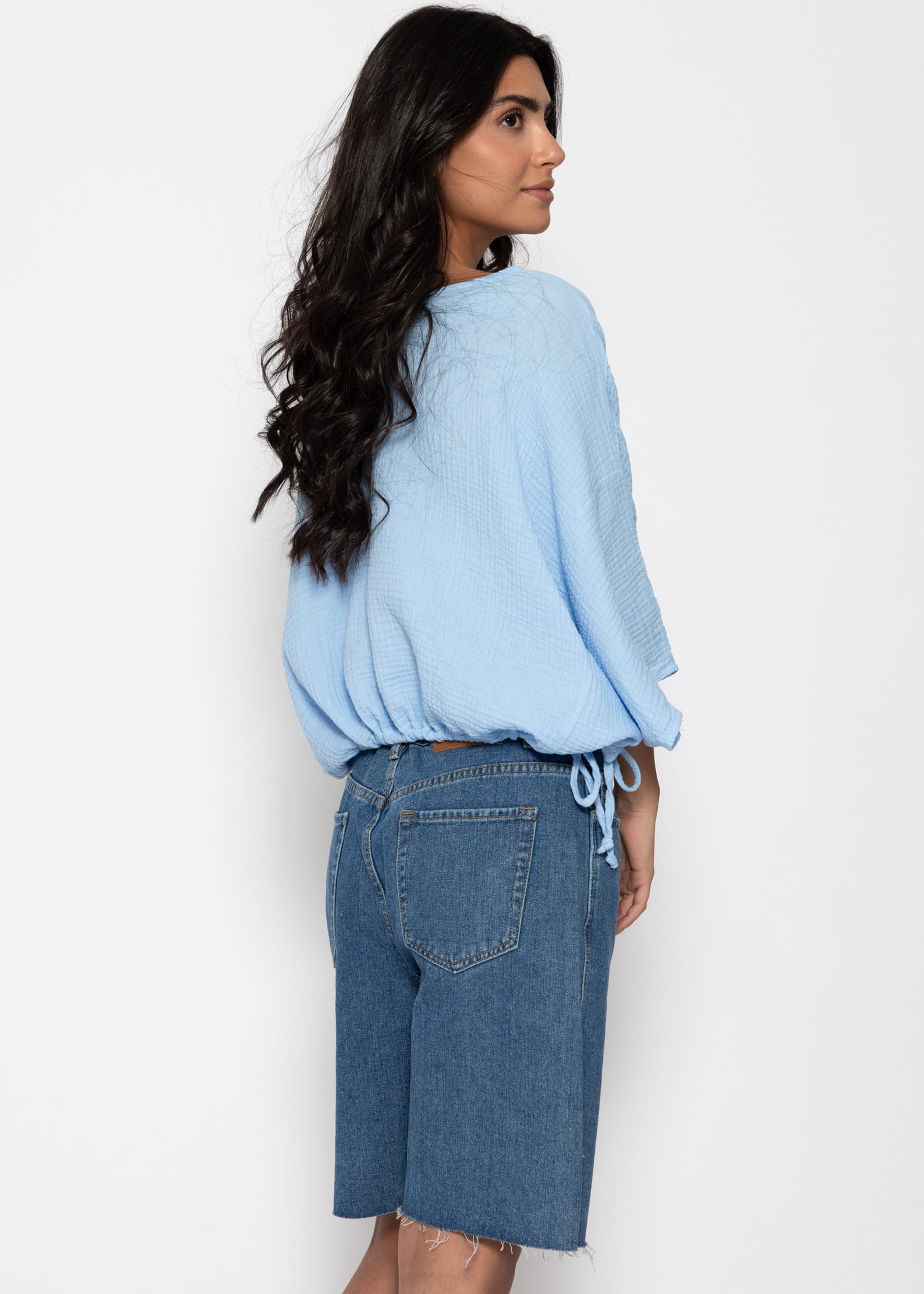 A breezy, oversized muslin shirt with a relaxed, flowing cut. Features dropped shoulders, a V-neck, and generous batwing sleeves. An elasticated drawstring hem ensures an adjustable fit and a modern, casual look.