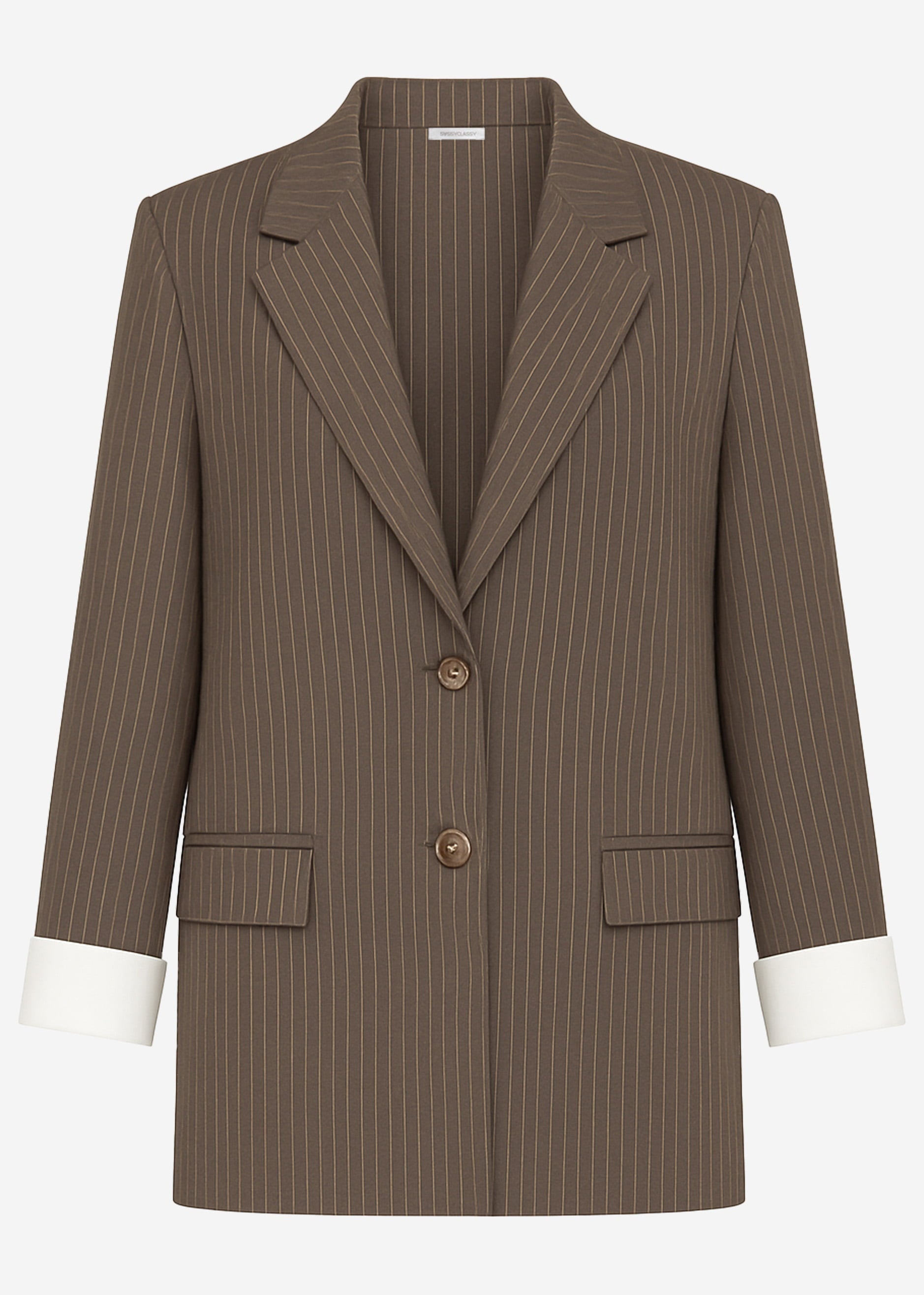 Brown oversized blazer with fine pinstripes and classic lapel collar. Casual cut with flap pockets and double-breasted button placket. Subtle shoulder pads for a structured silhouette.
