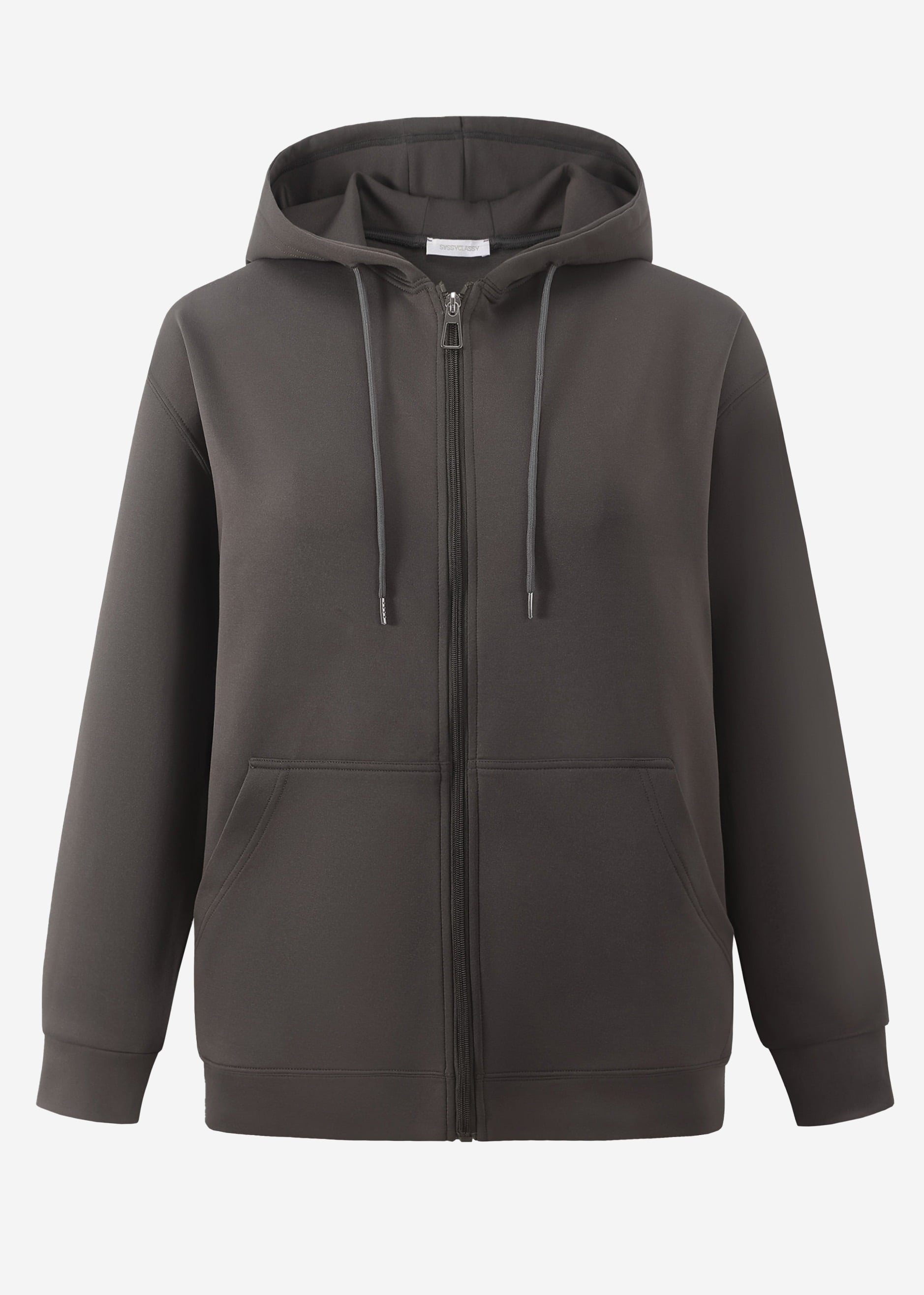 This hooded sweatshirt jacket impresses with its casual cut and high level of comfort. The soft material feels pleasant against the skin, while the loose fit ensures freedom of movement and a relaxed look. The full-length zipper makes it easy to put on and take off, and the hood with drawstring offers additional protection from wind and weather. Small essentials can be stored in the practical side pockets. Whether for everyday wear, leisure, or relaxing at home, this hoodie jacket is a versatile all-rounder for any occasion.
