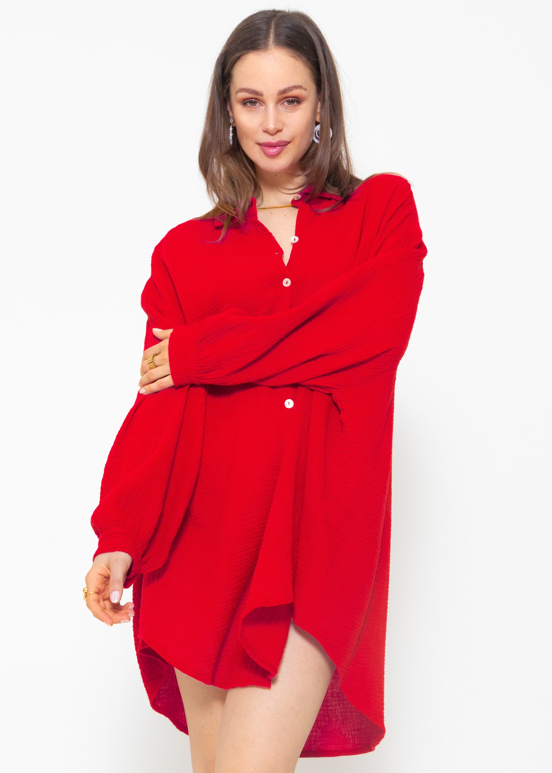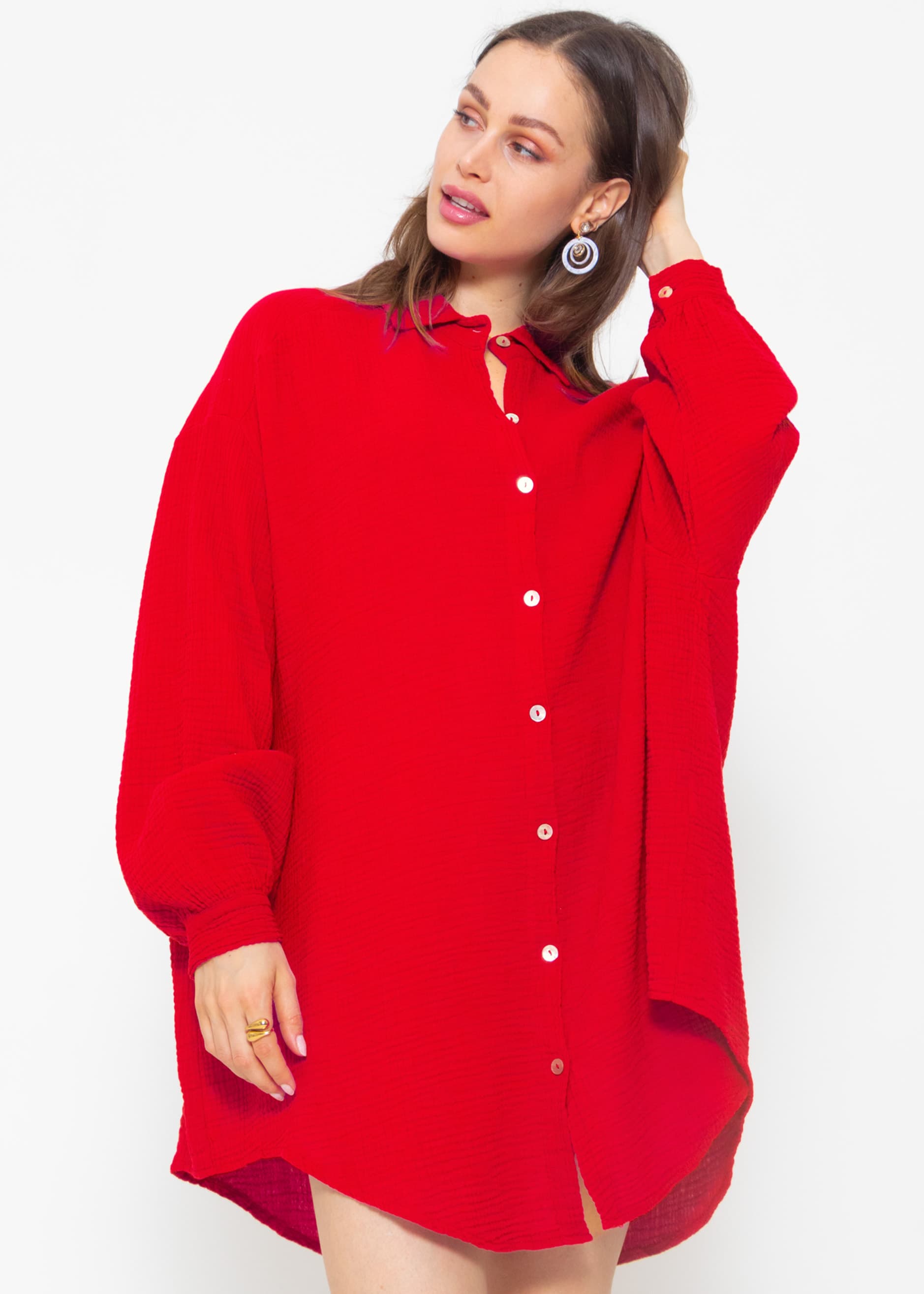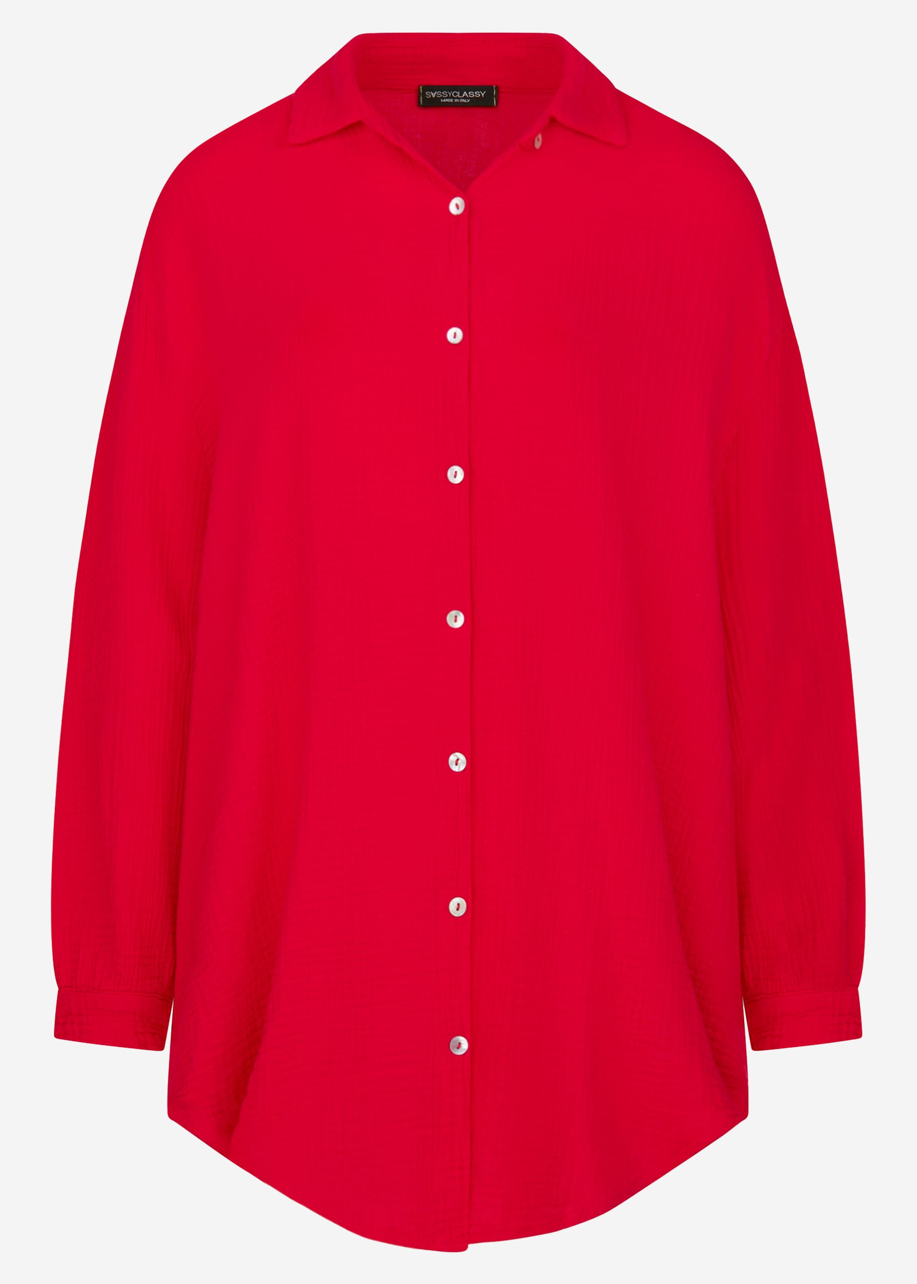 Loose-fitting blouse shirt in red made from lightweight, high-quality cotton muslin with mother-of-pearl buttons. This model is the long version of our muslin blouse. This stylish long blouse is made from the super soft, comfortable and breathable on-trend muslin fabric, making it an absolute must-have. It has a beautiful oversized cut, is slightly longer at the back than at the front and has dropped shoulders, giving it a casual look. The collar, button fastening, cuffs on the long sleeves and the horizontal pleat at the back give the muslin blouse special, lovely details and give it an elegant touch. It is a faithful companion for every season and can be combined in a variety of ways. Wear it as a classic blouse, open as a jacket or cardigan over a top, as a dress, under a sweater for a timeless layering look or simply knotted with a low neckline over a beautiful lace bra. This sophisticated all-rounder comes in one size and is recommended up to size 48.