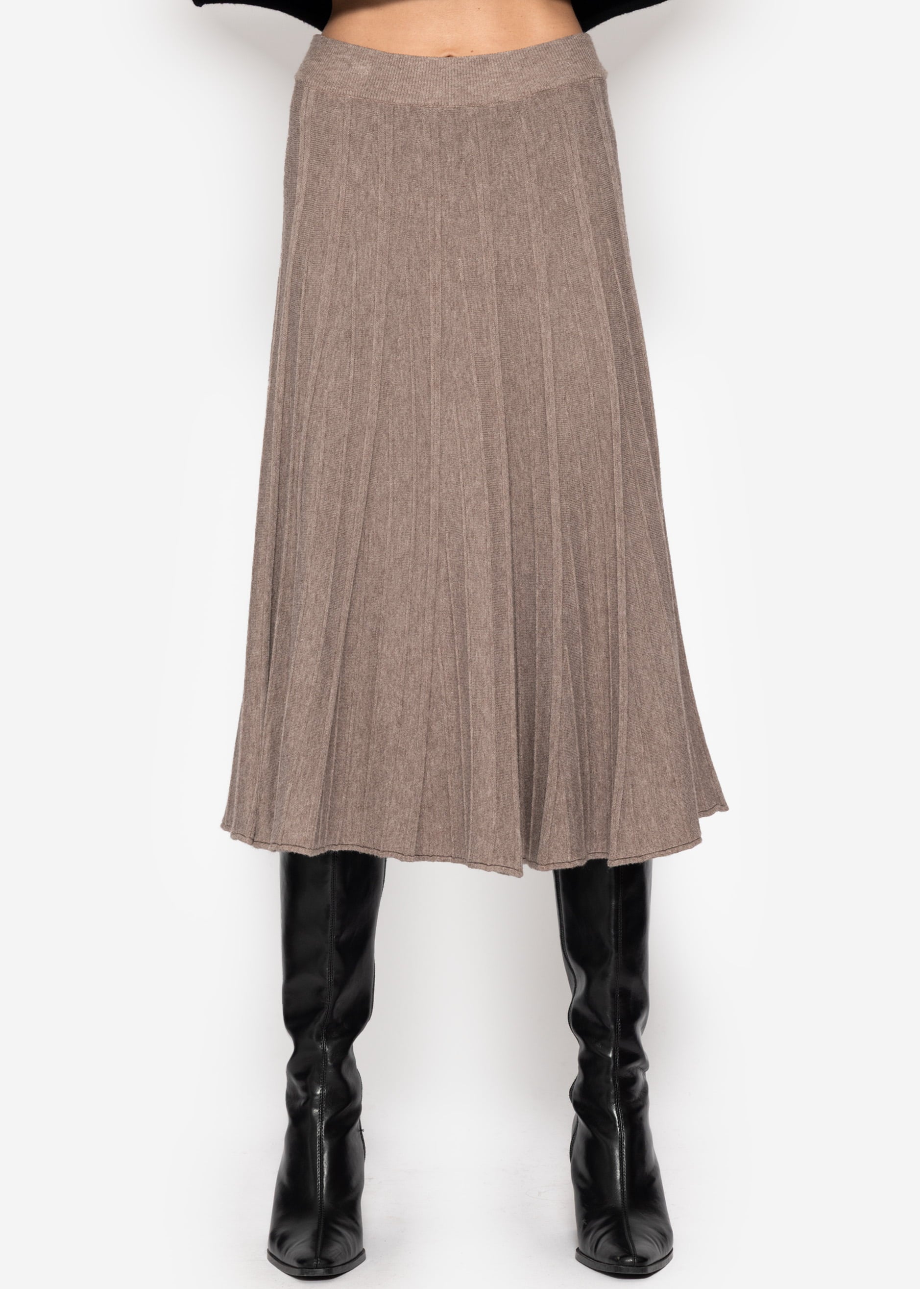 This knitted skirt impresses with its timeless elegance and exceptional comfort. The finely textured knit pattern with subtle pleats gives it a flowing silhouette that gently sways with every movement. Thanks to the elastic waistband, the skirt fits comfortably and adapts to the figure without being constricting. Whether paired with a sweater and boots for a casual everyday look or with a blouse and loafers for an elegant outfit, this knitted skirt is a versatile key piece that perfectly combines style and comfort.