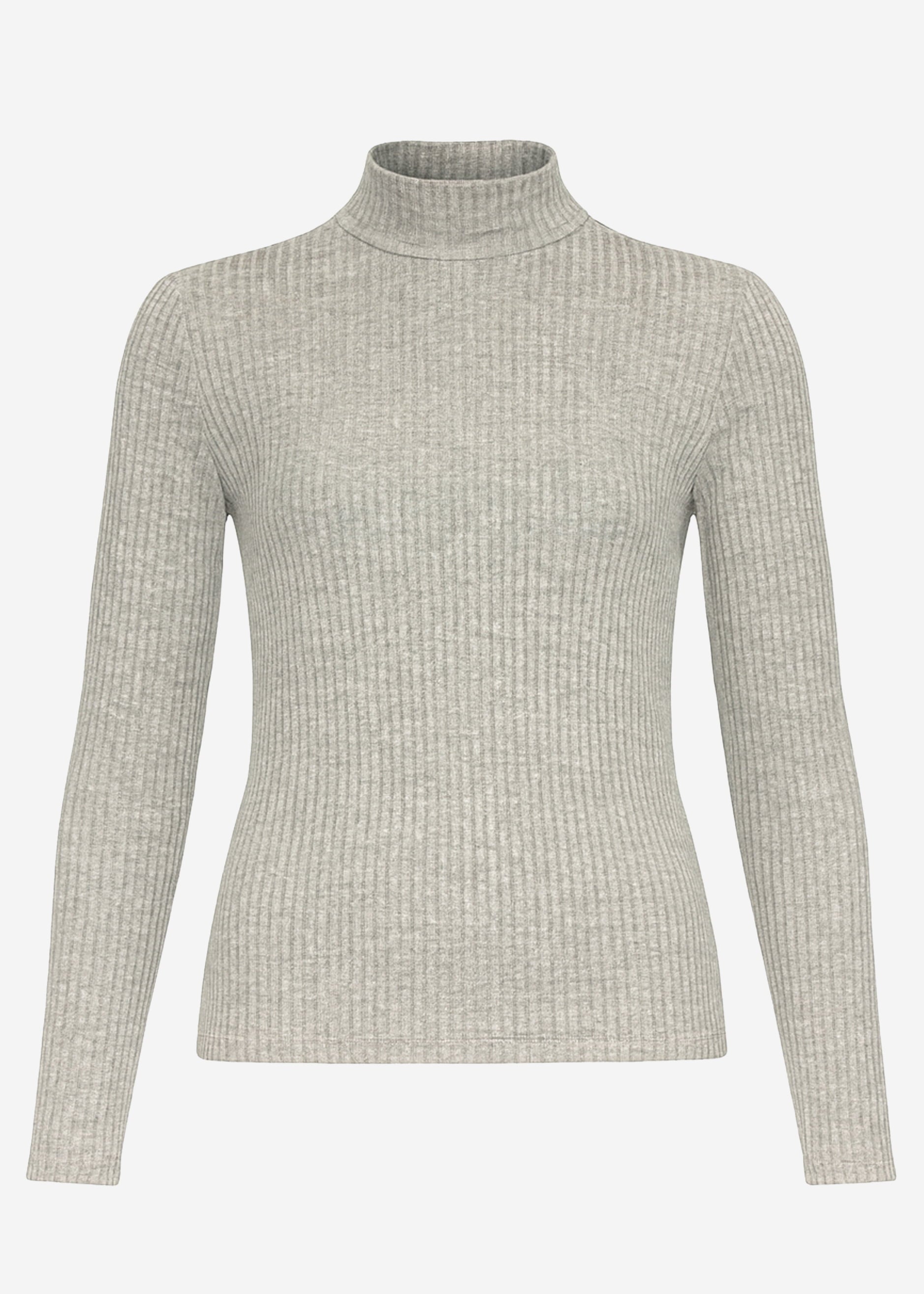 Ribbed long-sleeved shirt in grey with a narrow stand-up collar for a clean, feminine look. The figure-hugging fit and soft fine knit make it a versatile basic for layering and everyday outfits.