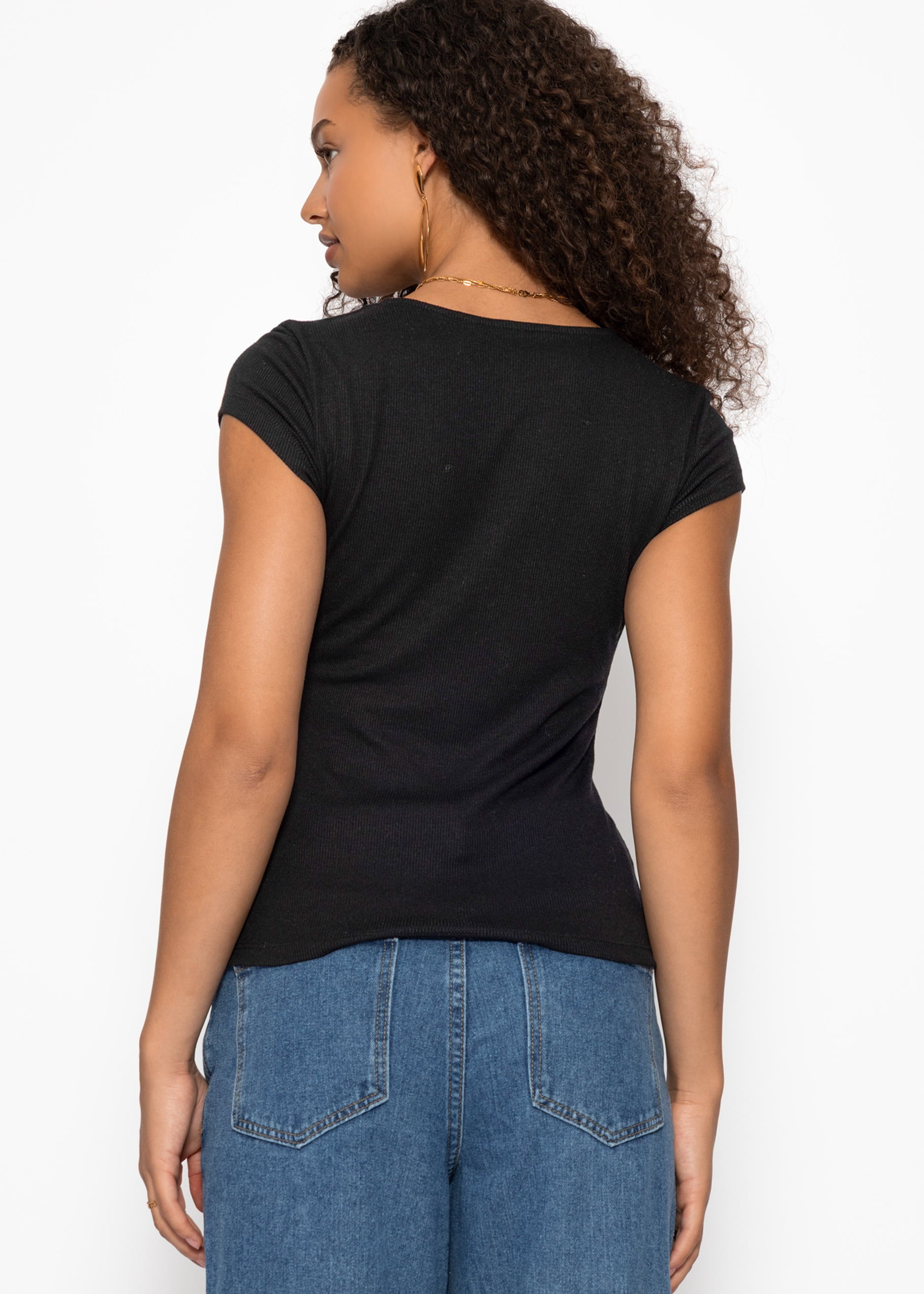 This short-sleeved shirt impresses with its modern yet timeless design. The soft, ribbed material feels pleasant against the skin and ensures a comfortable, figure-hugging fit. The neckline features a discreet button placket, which gives the T-shirt a casual touch and also offers a wide range of styling options. Whether worn on its own or layered under a jacket, this T-shirt is a versatile companion for every day.