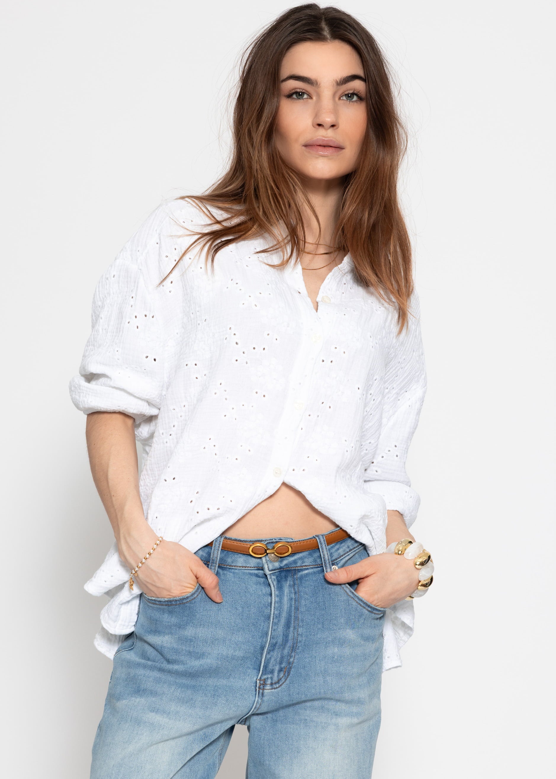 Short-sleeved muslin blouse with eyelet embroidery - white