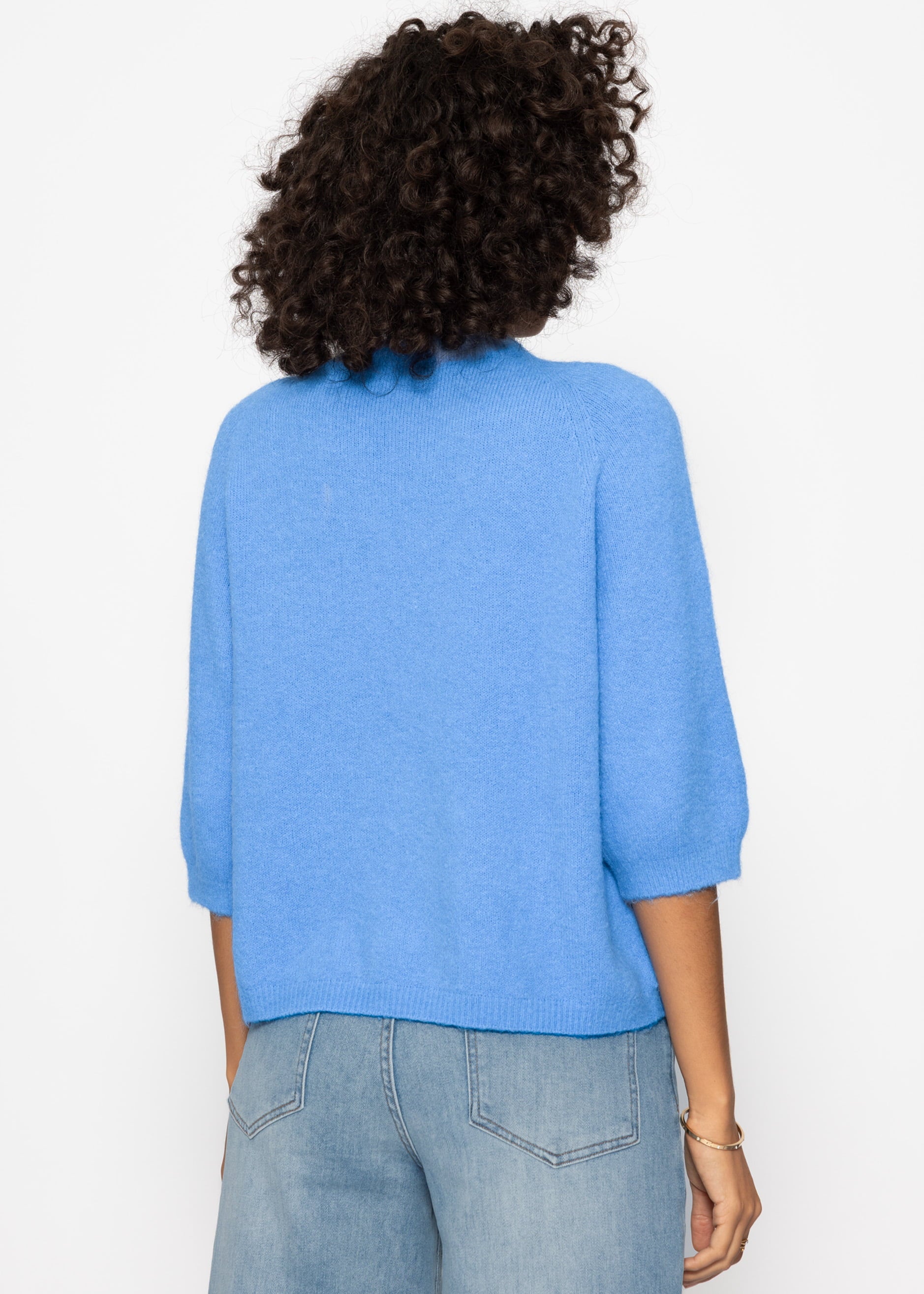 This blue knit top combines timeless elegance with cozy comfort. It features a round neckline and half-length sleeves made from soft knit fabric.