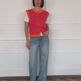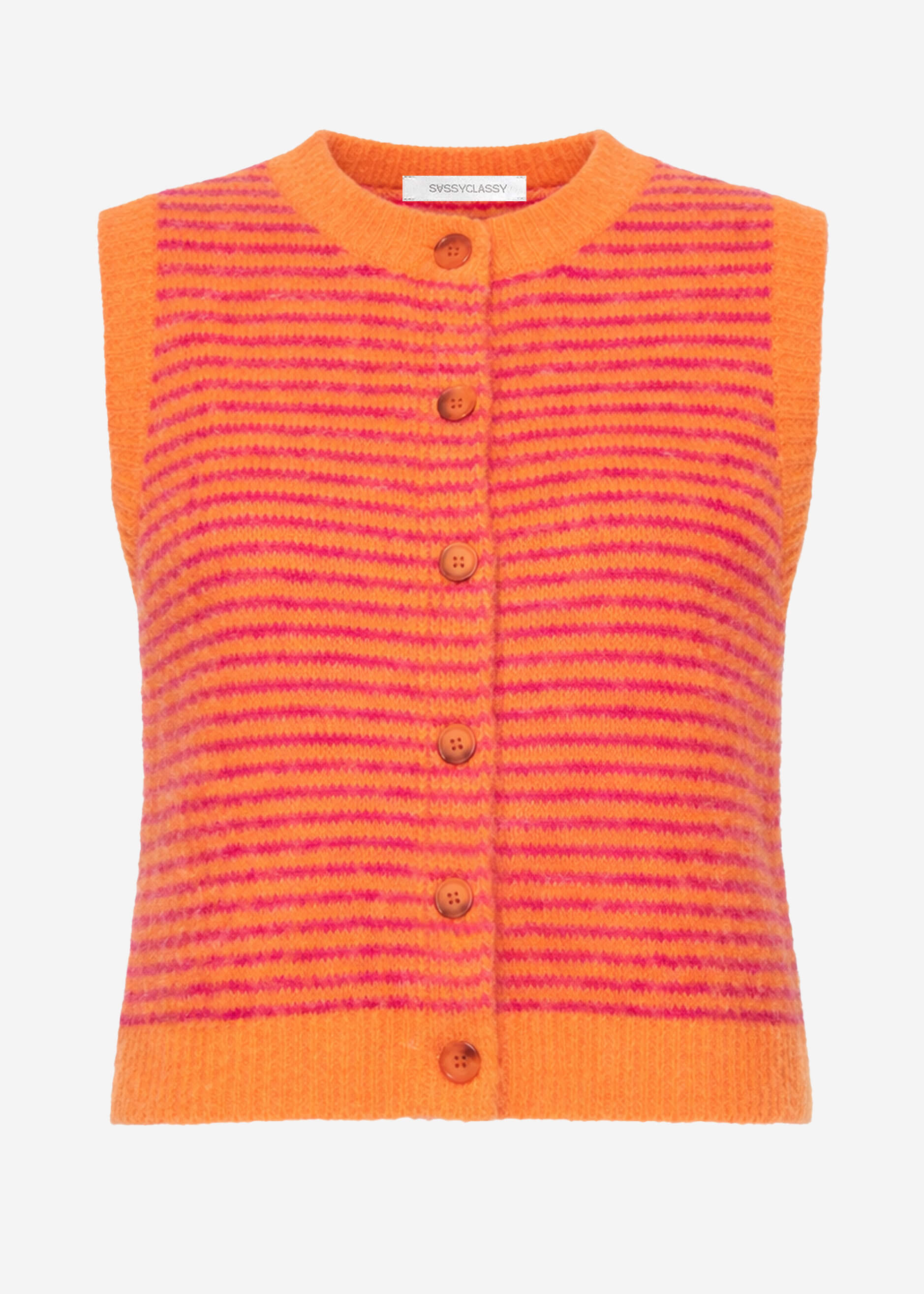 Modern striped knit vest in orange with a striking striped pattern. The knit gives the vest a casual feel and makes it the ideal layering piece for trendy looks. Perfectly combinable with simple tops for a fresh, fashionable accent.