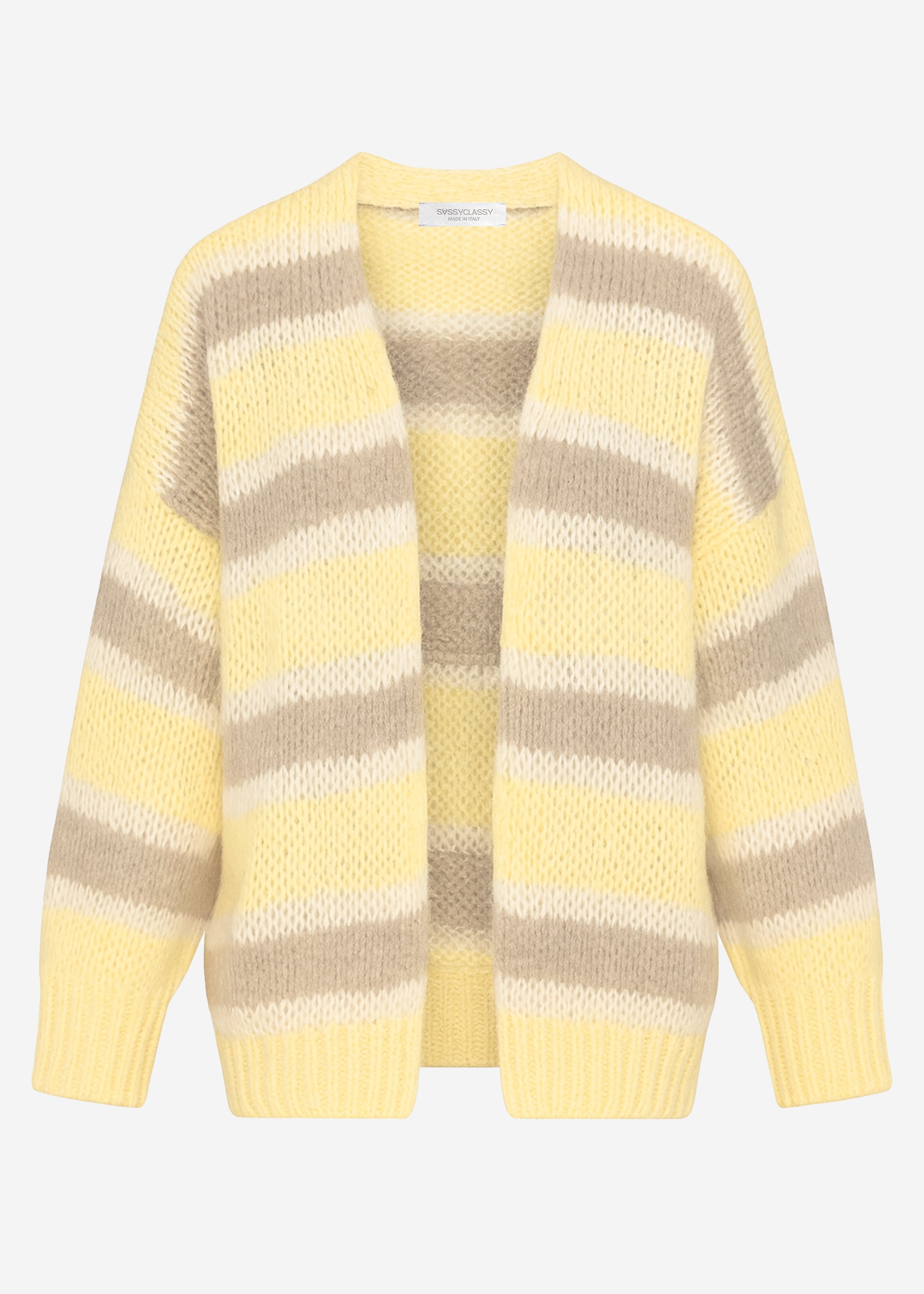 Chunky knit cardigan with wide stripes and an open front. Loose oversized fit with dropped shoulders for a casual drape. Soft chunky knit for a cozy look.