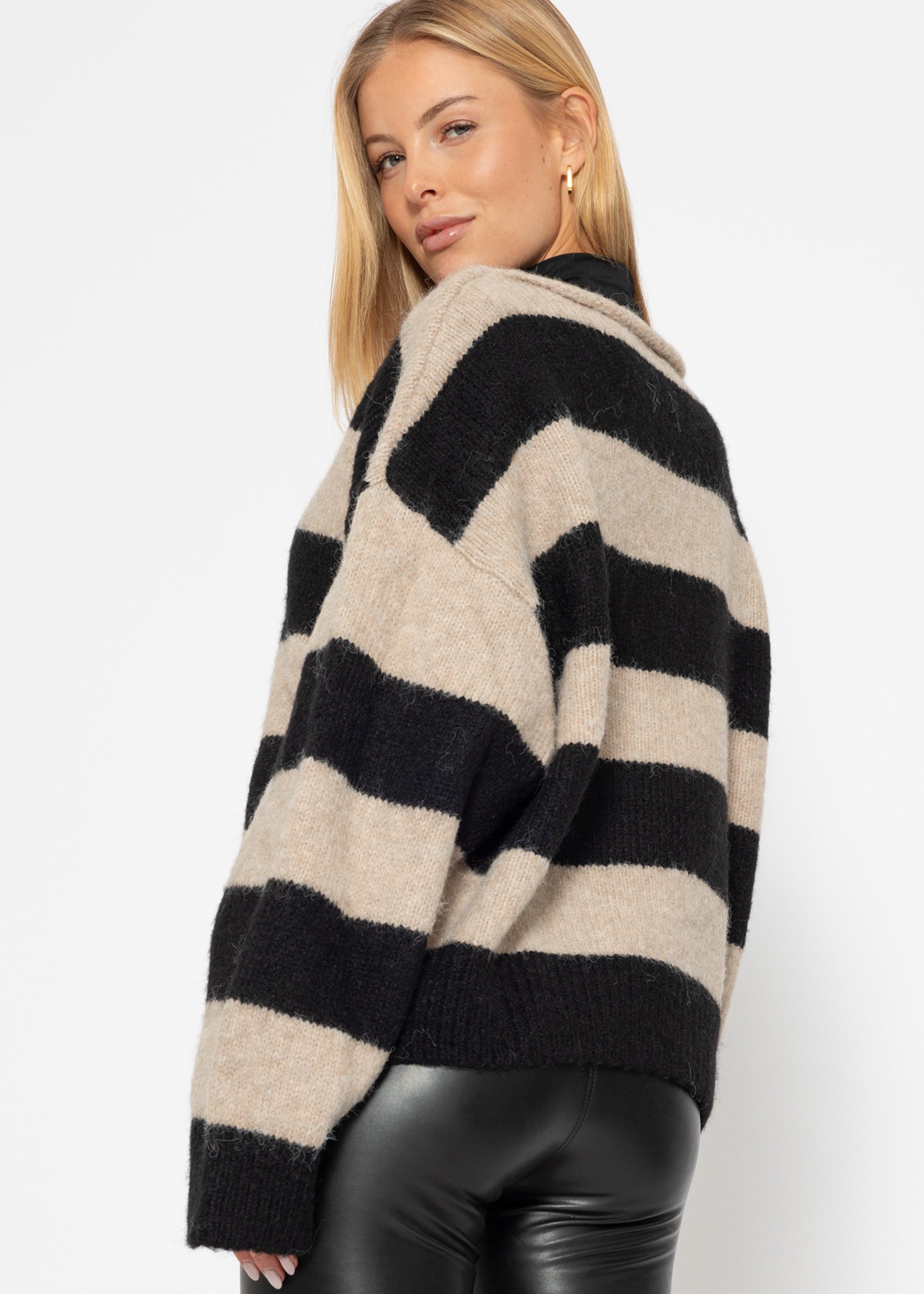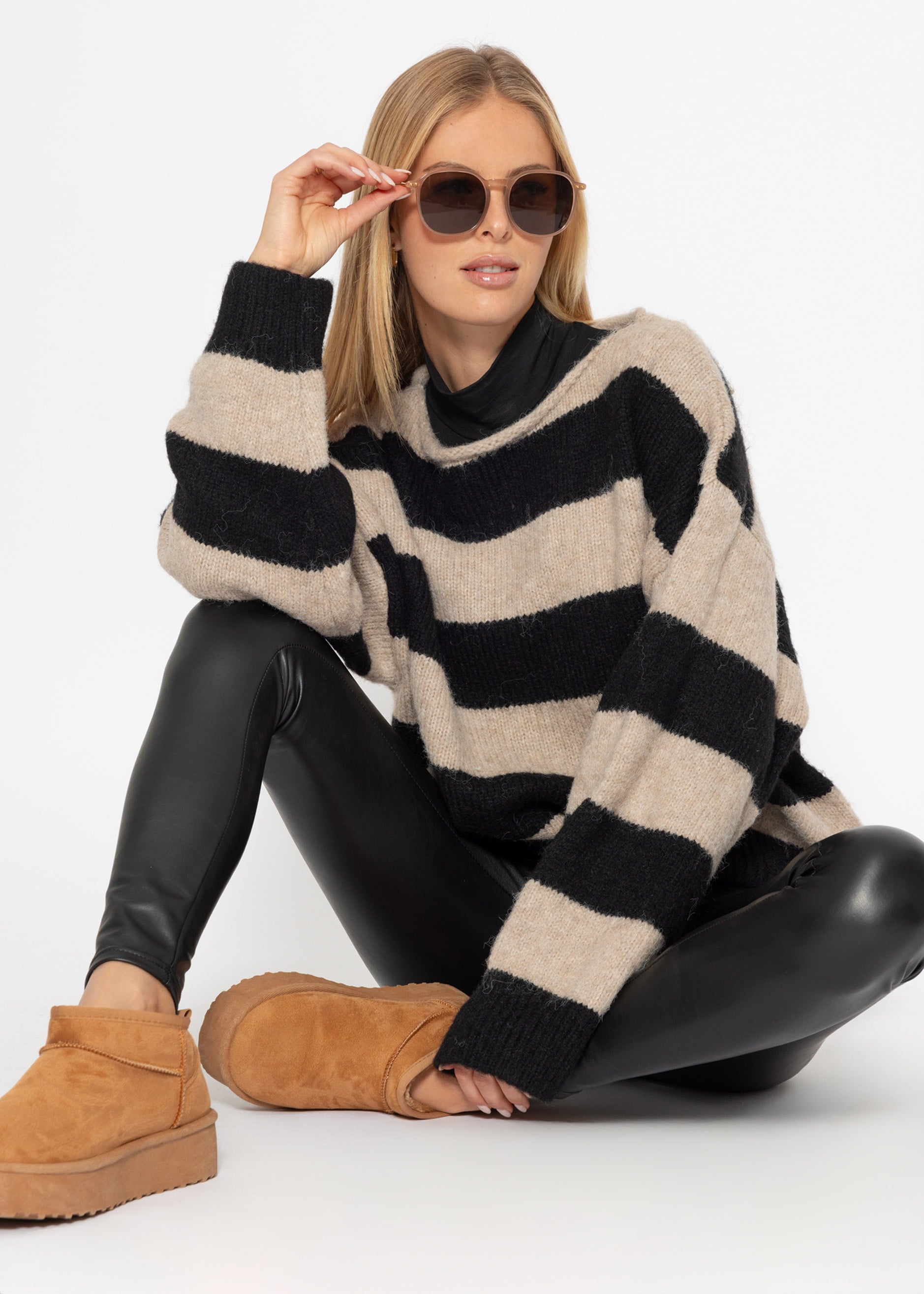 This sweater combines comfort and trendy design in a unique way. The oversized cut gives the sweater a casual and trendy look and offers freedom of movement throughout the day. The boat neckline adds a sporty touch and gently accentuates your collarbones. Wide sleeves and dropped shoulders give the design a relaxed silhouette, while the striped look adds timeless elegance and a certain sophistication. Ribbed cuffs and a ribbed hem skilfully round off the design.