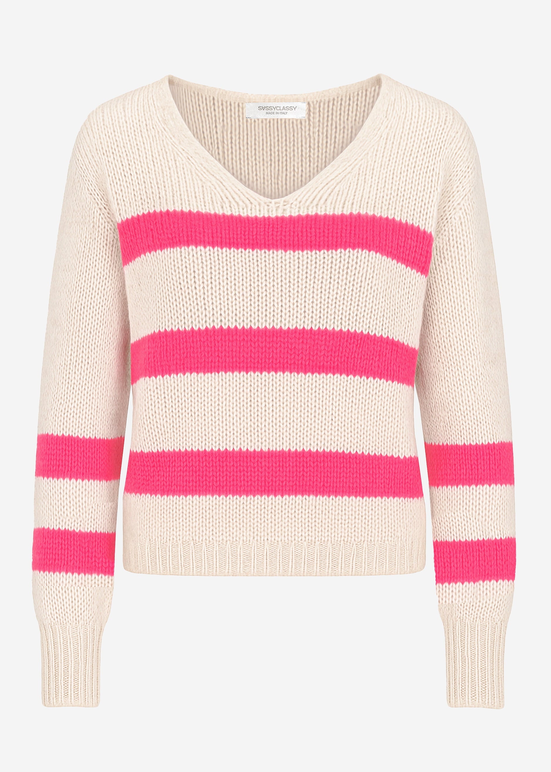 Oversized sweater in a super soft, loose knit. The sweater has a V-neckline and long sleeves with cuffs. Stripes in pink make the sweater shine. You can find this style here in several color variations.