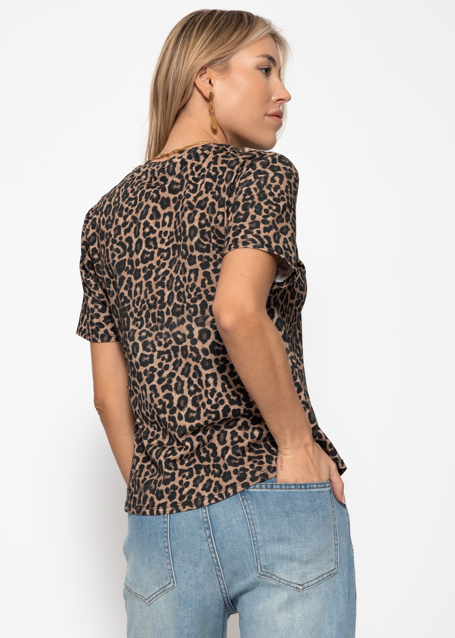 T-shirt with a trendy leopard print in brown. The fitted cut and classic crew neck create a timeless silhouette, while the striking pattern adds a fashionable touch. Perfectly combinable with jeans, skirts, or under blazers for stylish everyday outfits.