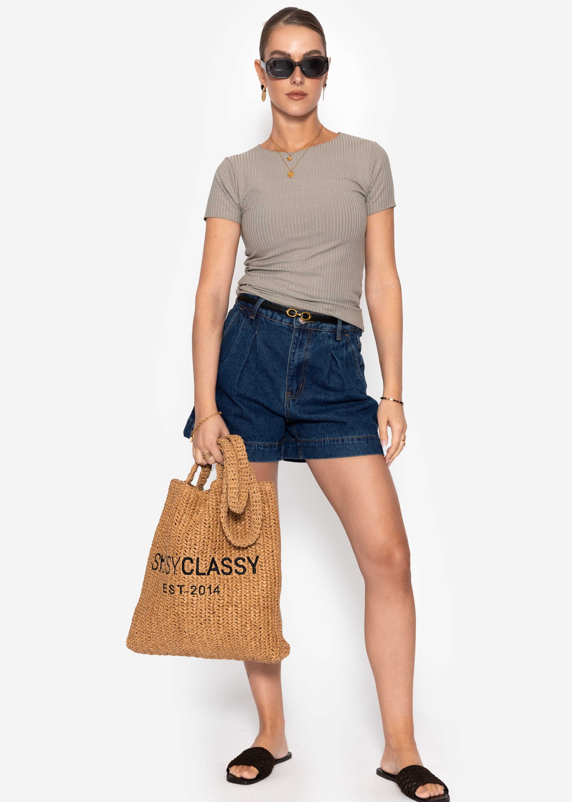 Diese dunkelblaue Jeansshorts im High-Waist-Schnitt bietet entspannten Tragekomfort und Retro-Charme. Das Design mit weitem Bein, Bundfalten, seitlichen Eingrifftaschen und Gürtelschlaufen ist aus robustem Denim gefertigt.