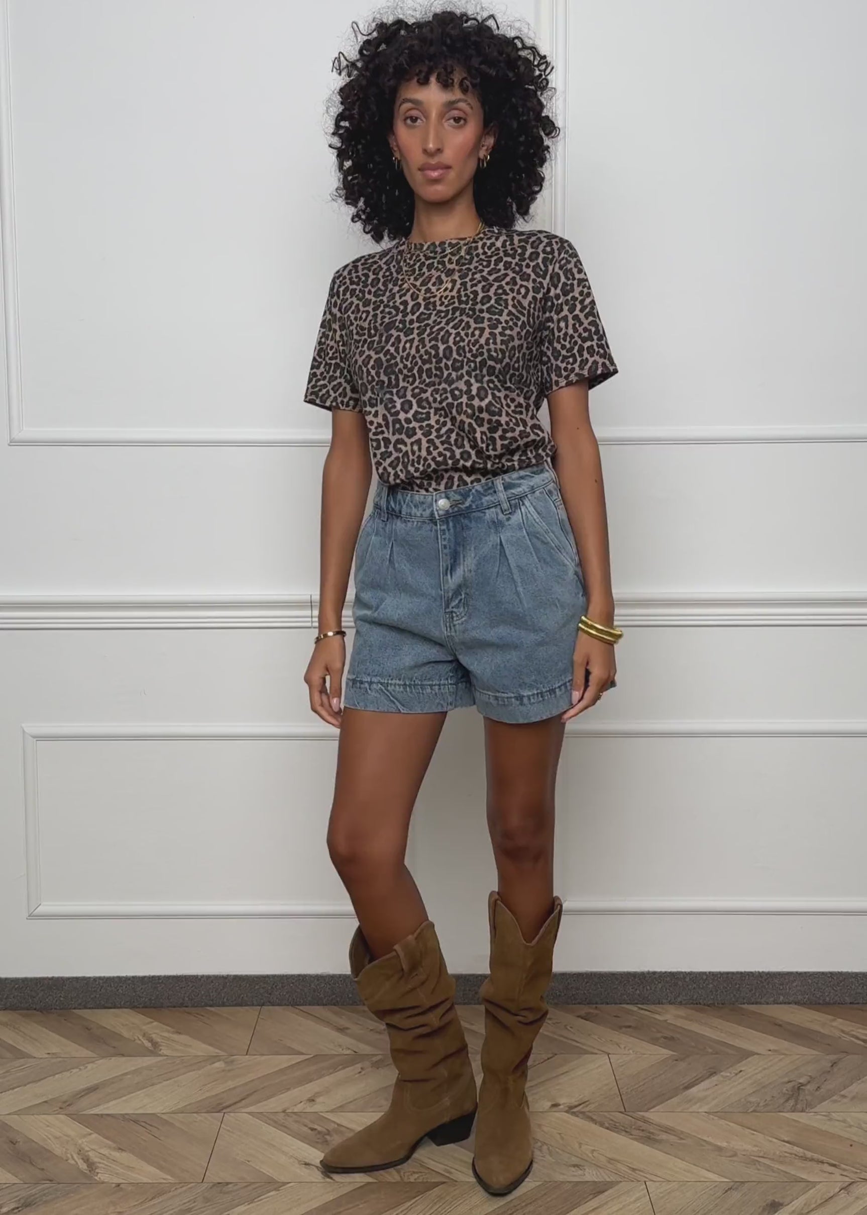 These light blue high-waisted denim shorts offer relaxed comfort and retro charm. The wide-leg design, with pleats at the waistband, side pockets, and belt loops, is made from durable denim.