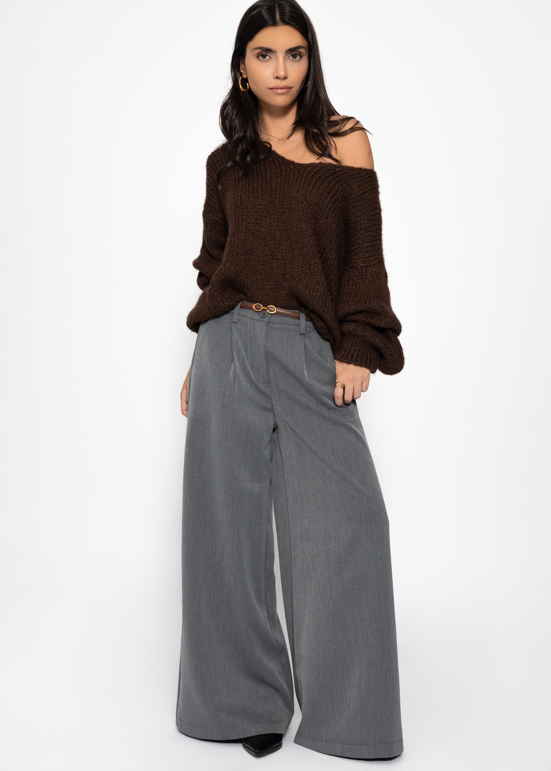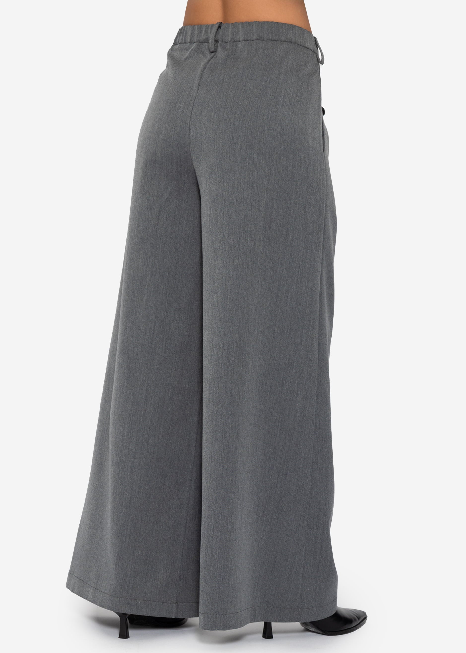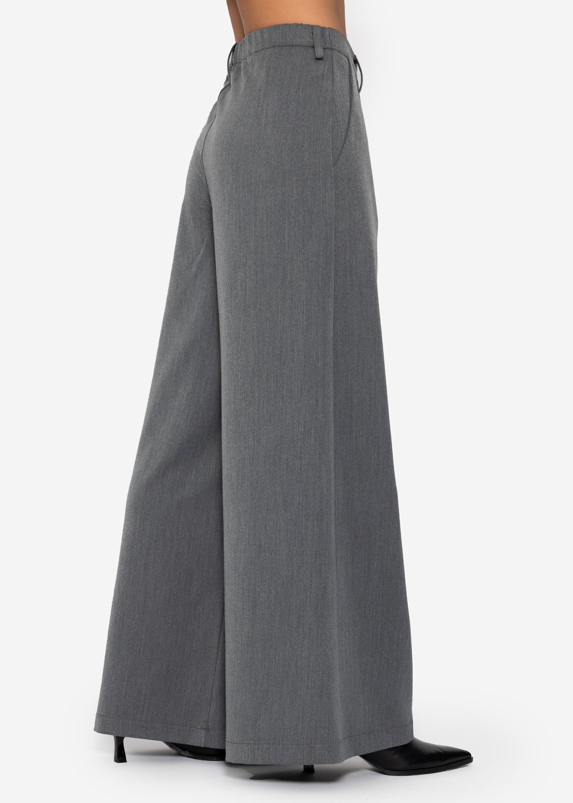 Graue Anzughose mit weitem Bein und hohem Bund. Elegantes Design mit Bundfalten und seitlichen Eingrifftaschen. Fließendes Material für eine moderne, lässig-schicke Silhouette.