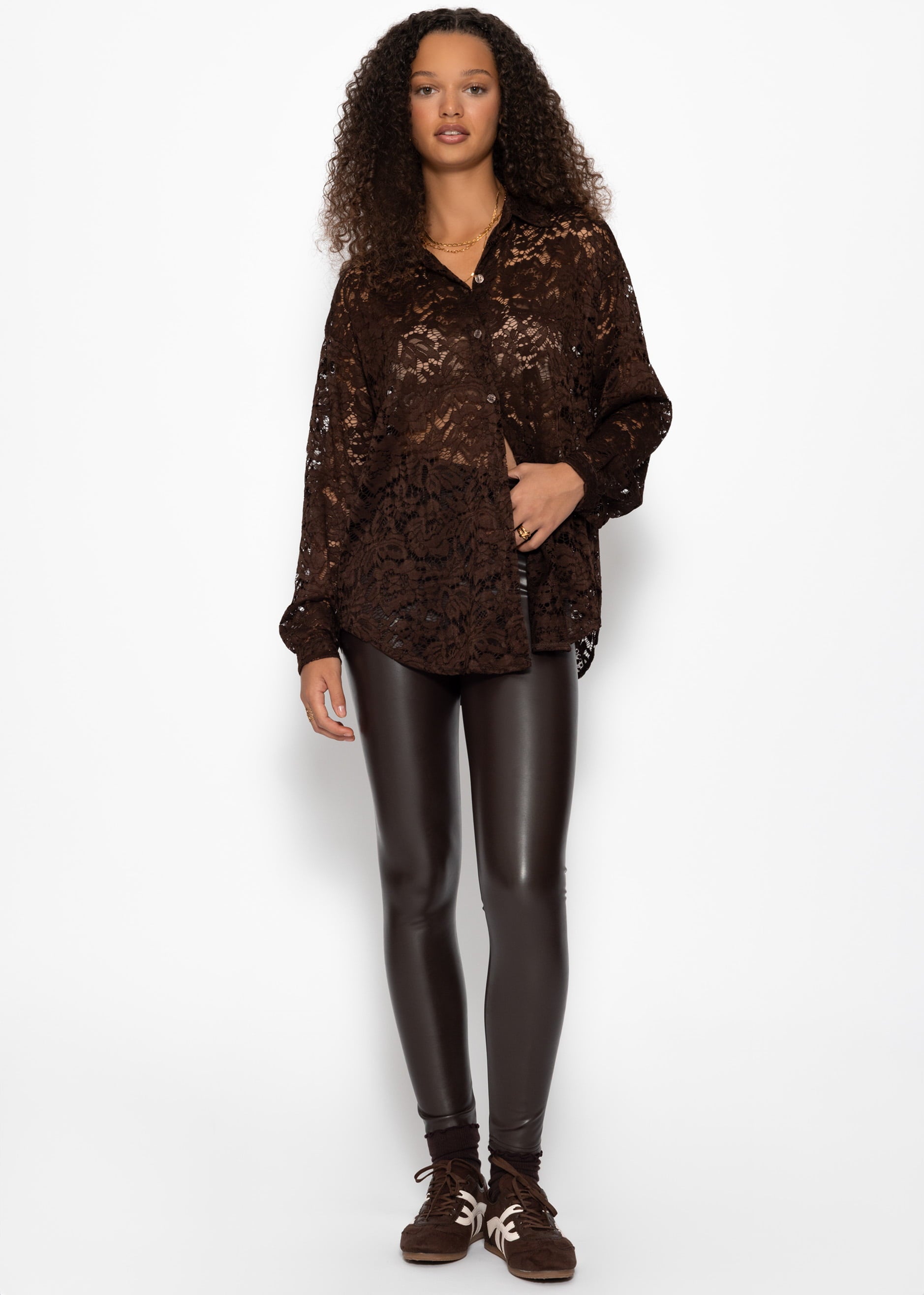Diese edle Spitzenbluse in Braun vereint feminine Eleganz mit modernem Chic. Das transparente Material verleiht dem Look eine verführerische Note, während der klassische Hemdblusenkragen für einen stilvollen Ausgleich sorgt. Der lockere Schnitt sorgt für eine fließende Silhouette und lässt sich vielseitig kombinieren – etwa mit einem Top darunter und Lederleggings für einen trendigen Abendlook. Manschettenärmel und Knopfleiste runden das Design hochwertig ab. Ein Must-have für besondere Anlässe oder als stilvolles Statement im Alltag.