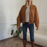 Diese Bomberjacke aus hochwertigem Wildlederimitat ist lässig und weich. Sie präsentiert sich in einem warmen Braunton mit feinen Ziernähten und einem klassischen Bomber-Style.