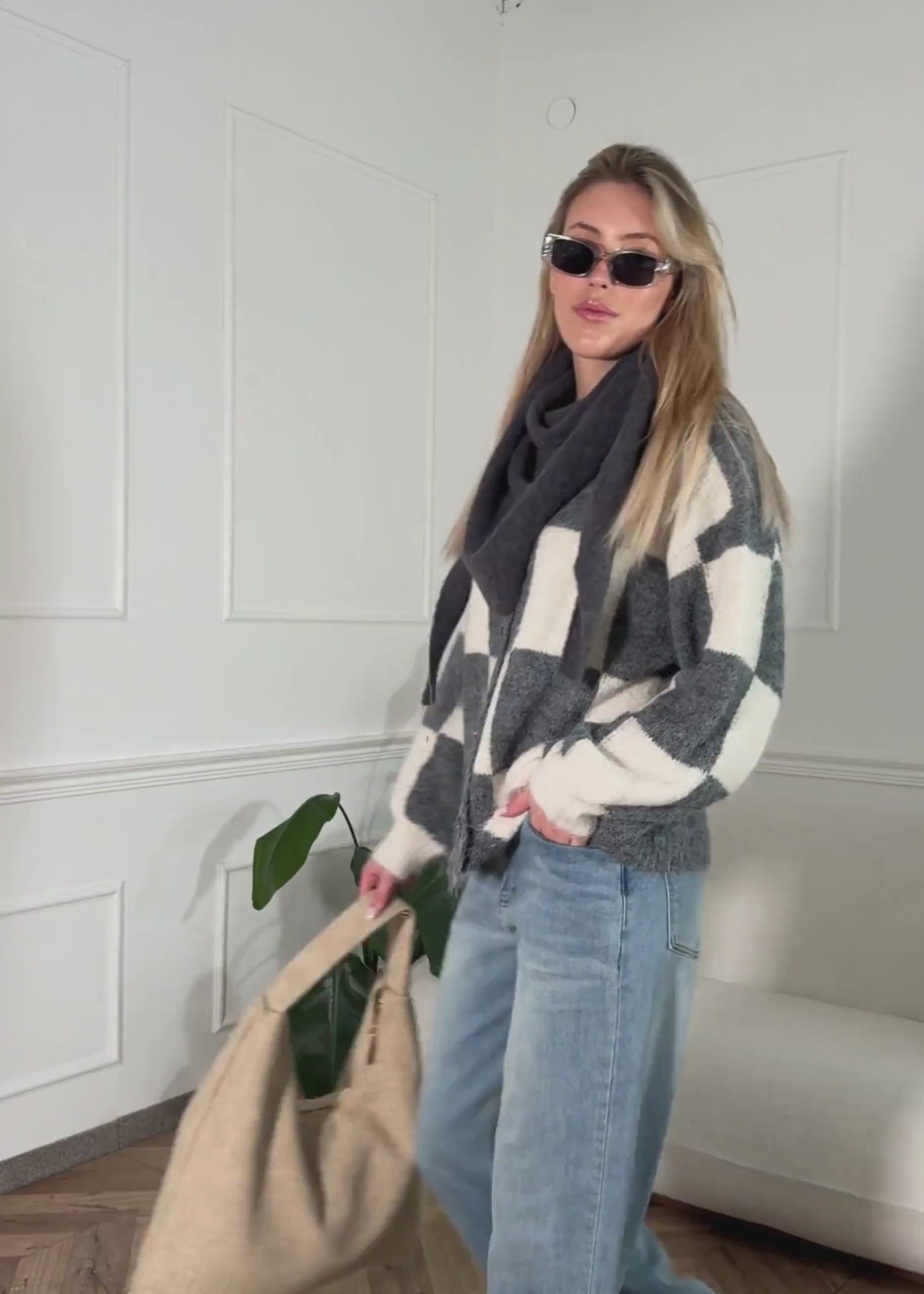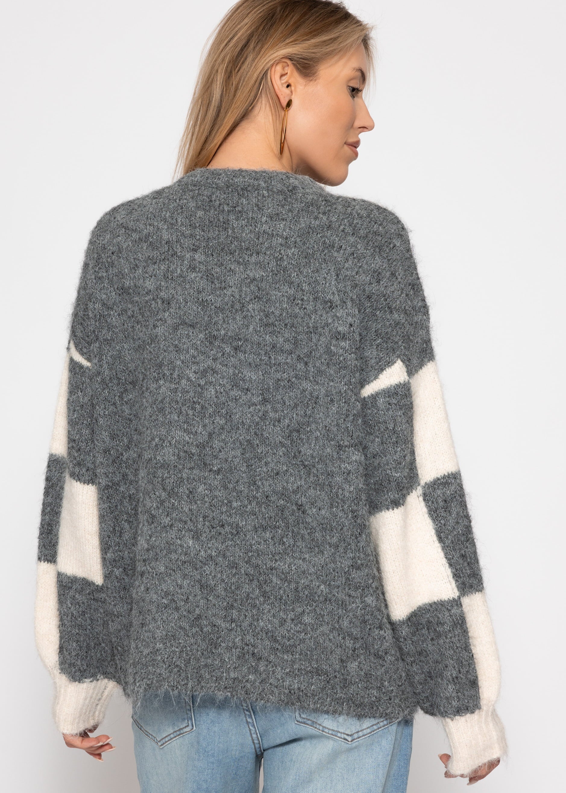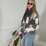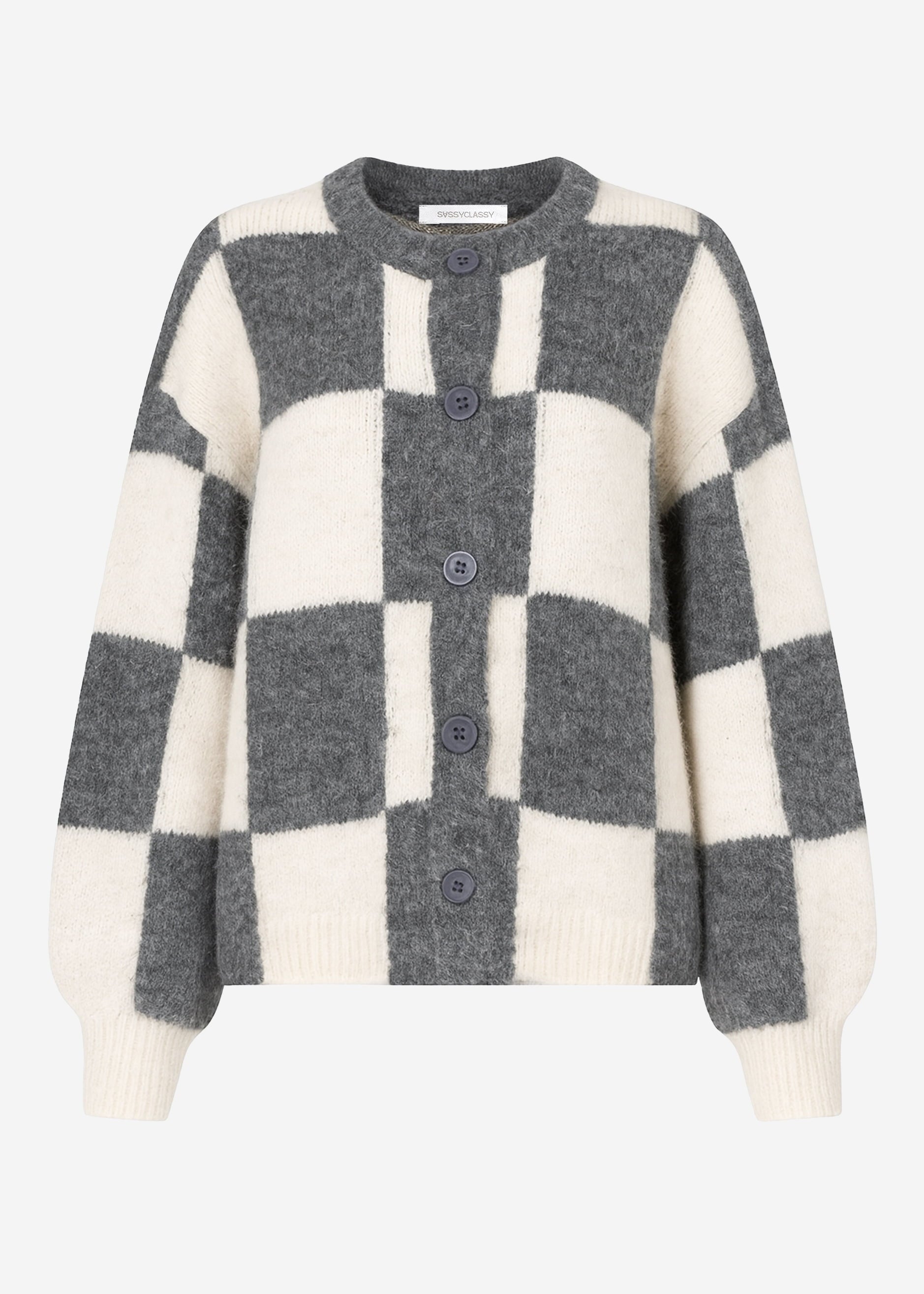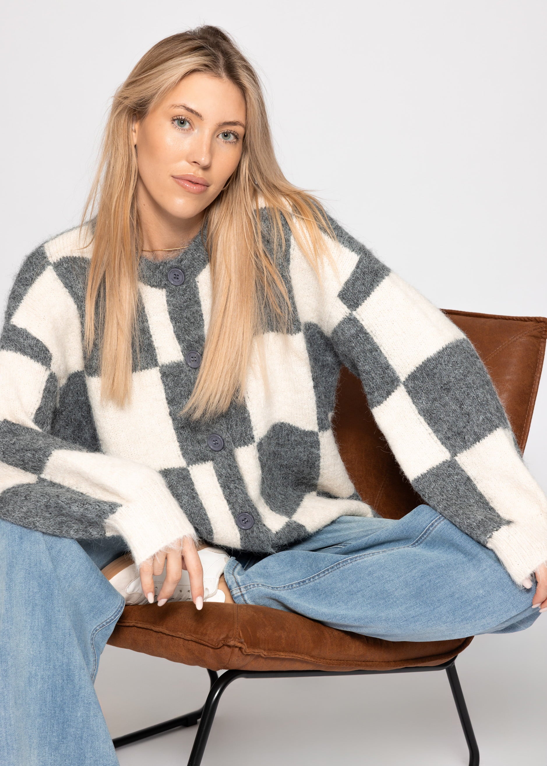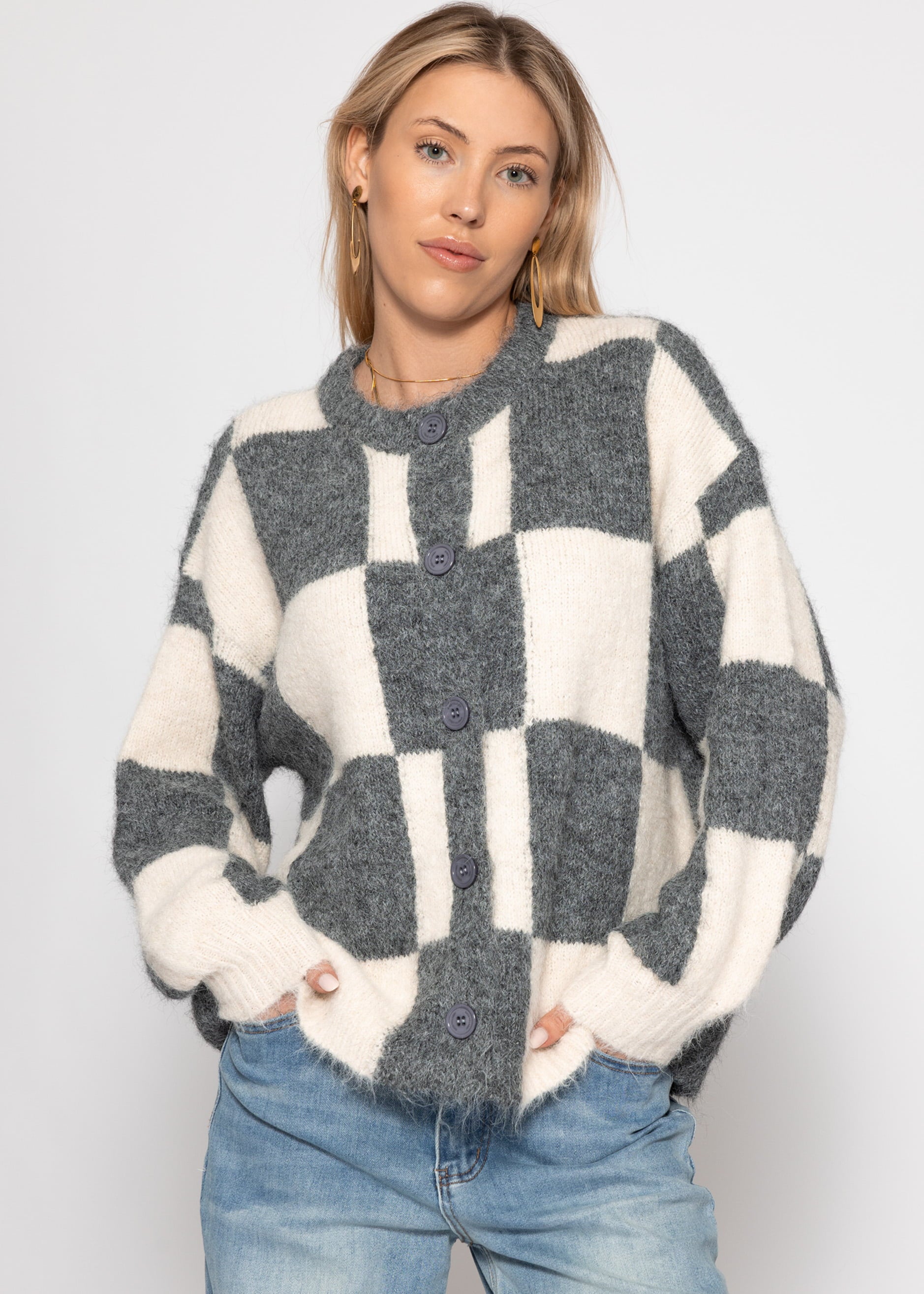 Gestrickter Cardigan mit markantem Karo-Muster auf der Vorderseite in Grau und Offwhite. Lockerer, leicht flauschiger Look mit Rundhalsausschnitt und grauen Knöpfen. Ein cozy Statement-Piece für entspannte Outfits.