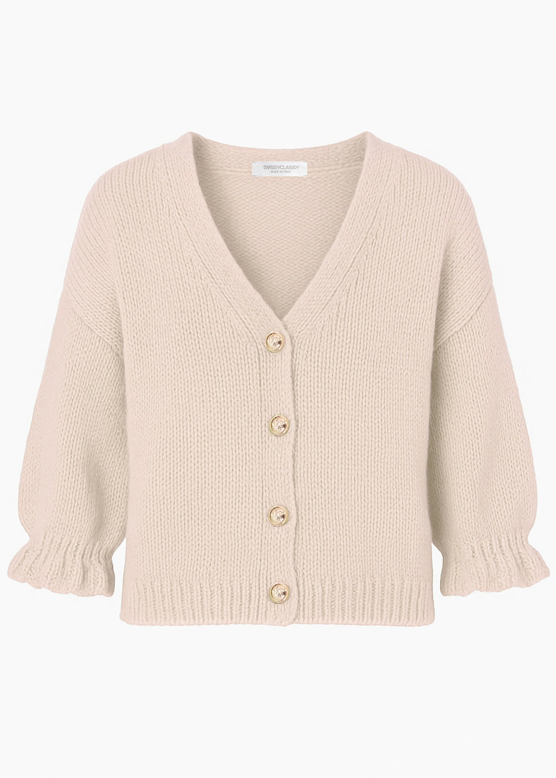 Dieser offwhite Cardigan überzeugt durch seine lässige Passform und den gemütlichen Strick. Die 3/4-Ärmel mit breiten Rippbündchen verleihen dem Modell eine feminine Note.